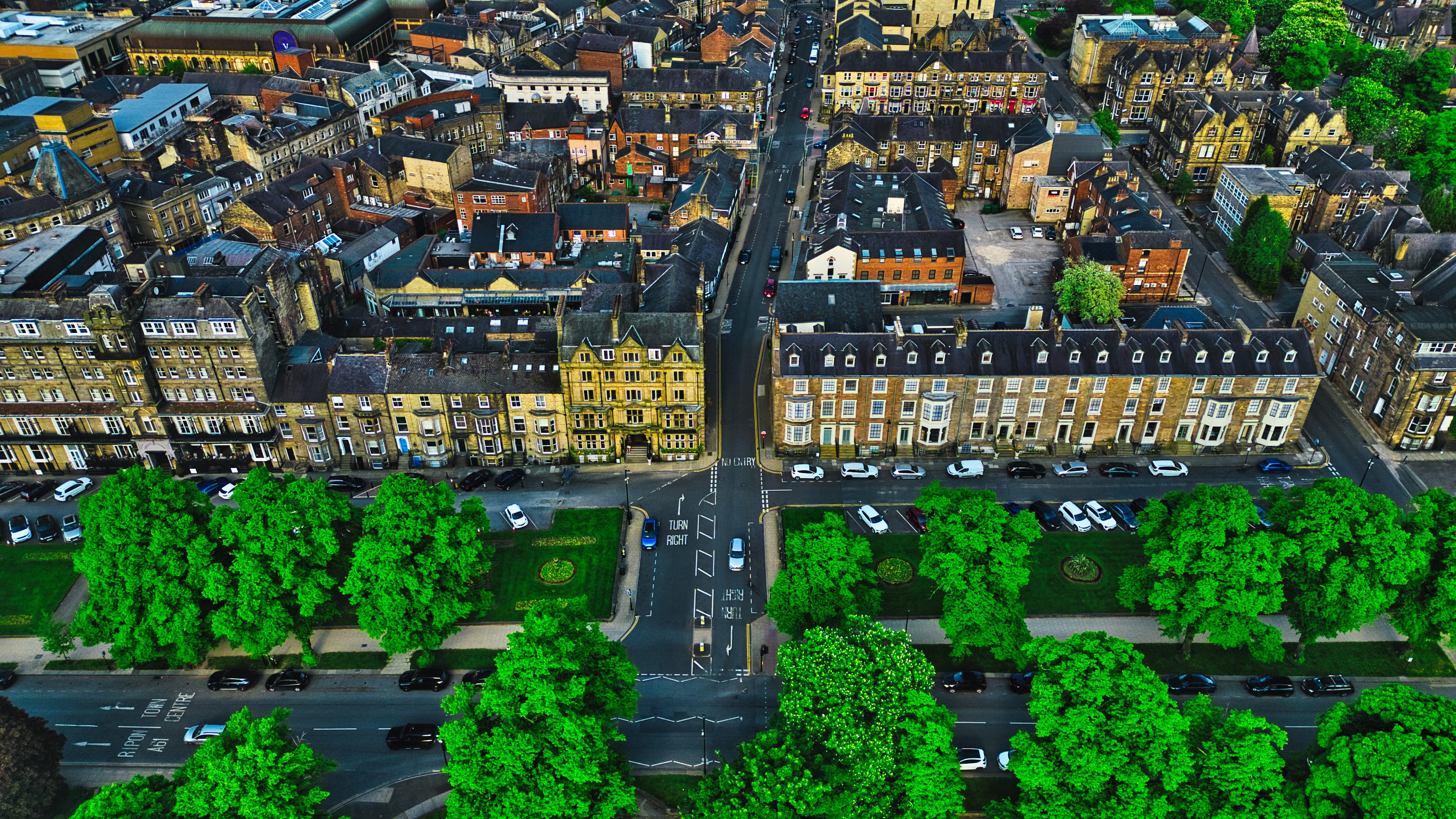 Aerial view of a cityscape with a mix of historic and modern buildings, tree-lined streets, and parked cars. The image shows a vibrant urban area with green spaces and well-maintained architecture.