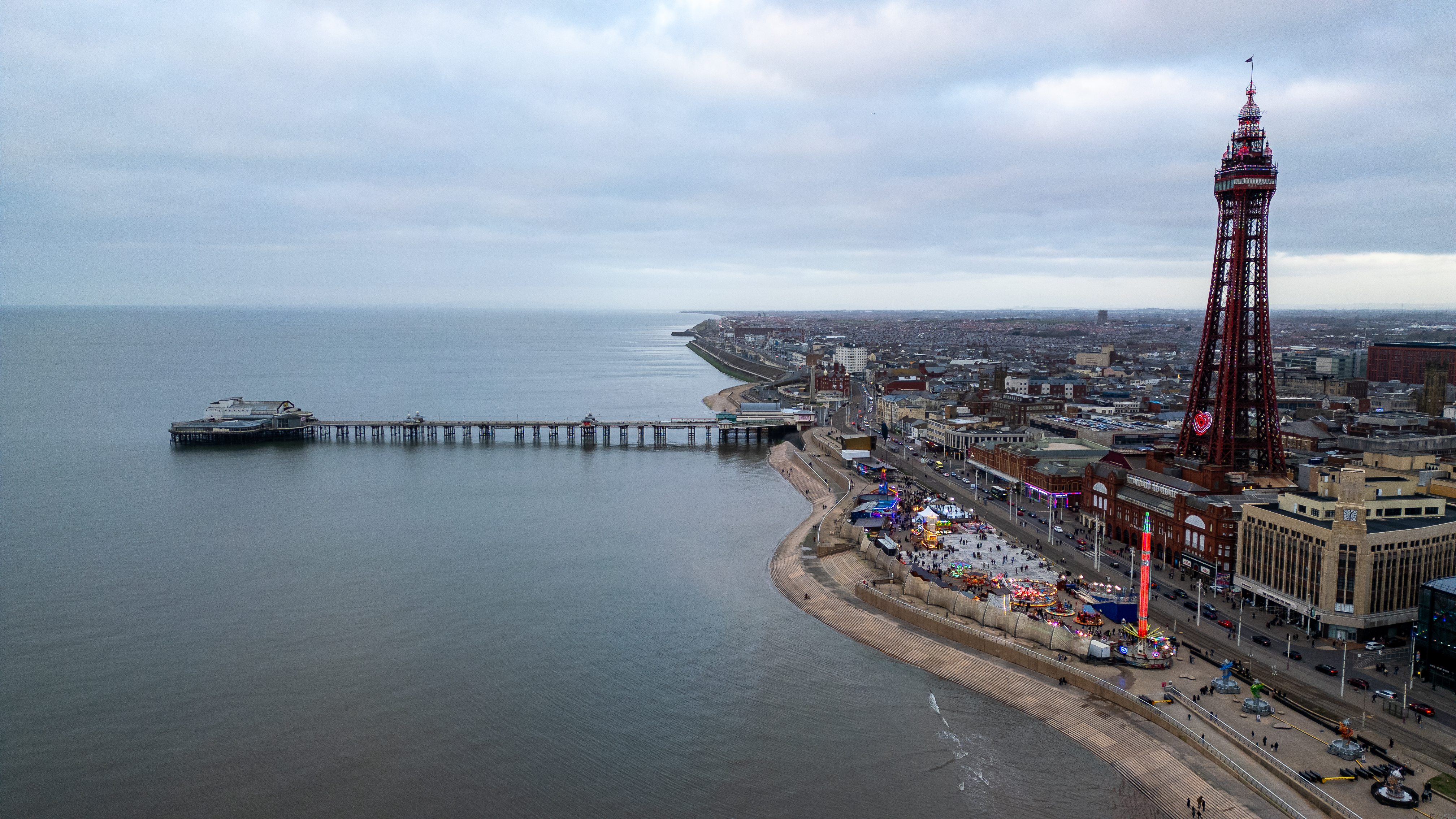 An aerial view of a coastal city, featuring a tall red tower, a pier, and a beach promenade with amusement rides under a cloudy sky in Blackpool, UK.