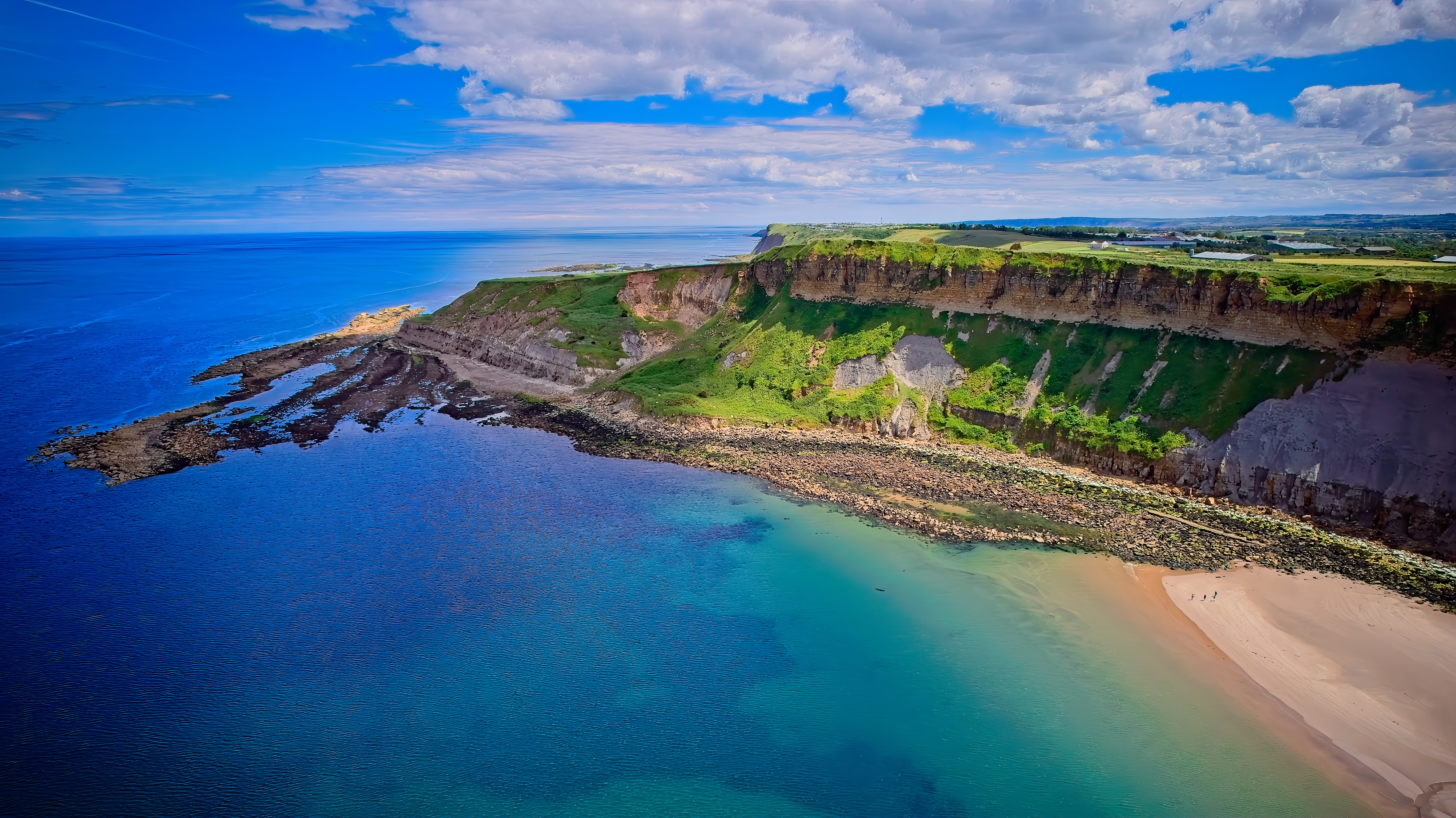 Aerial view of a coastal cliff with lush greenery, rocky shoreline, and clear blue waters under a partly cloudy sky.