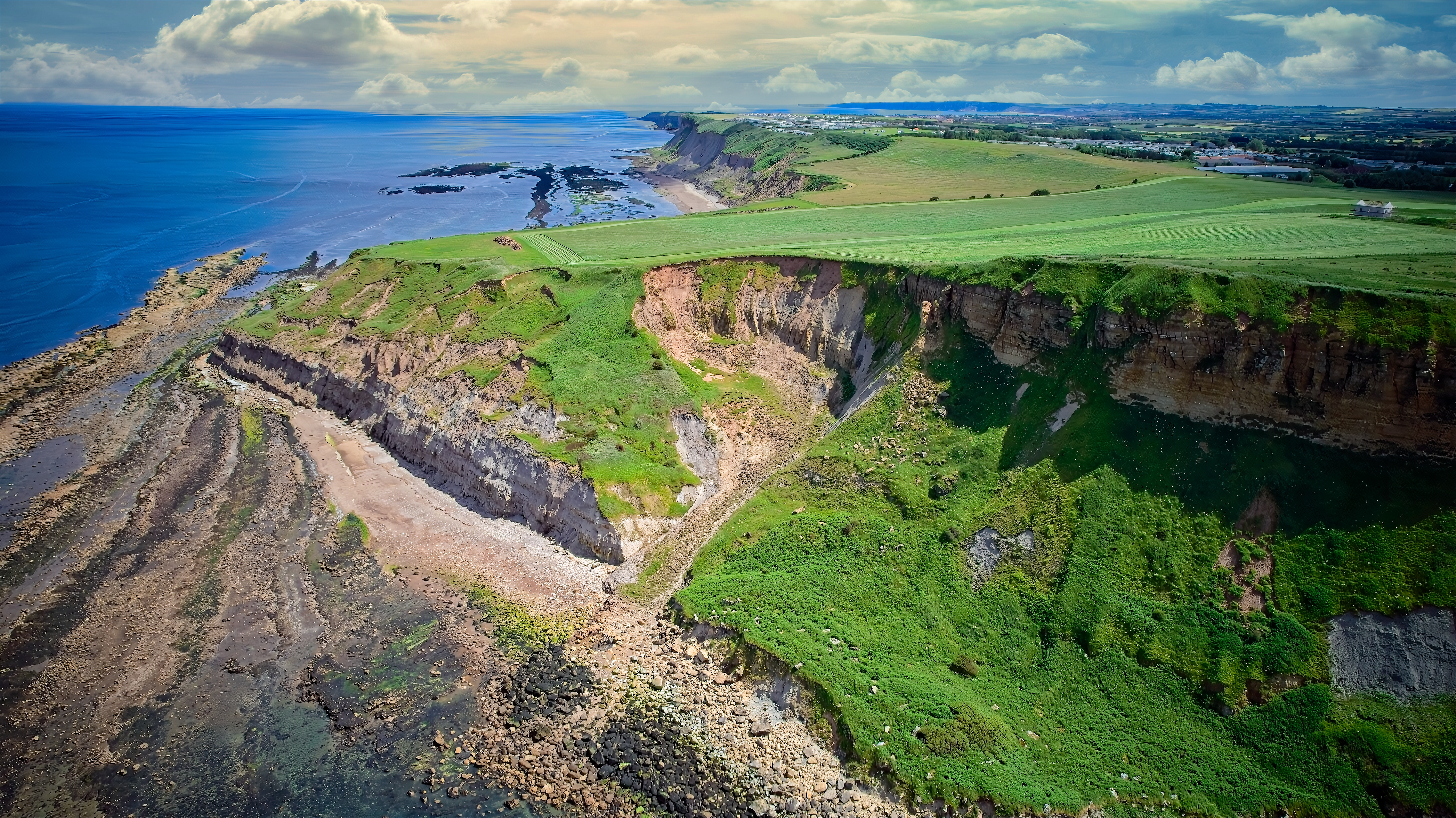 Aerial view of a coastal cliff with green fields on top, rocky shoreline, and blue ocean under a cloudy sky.