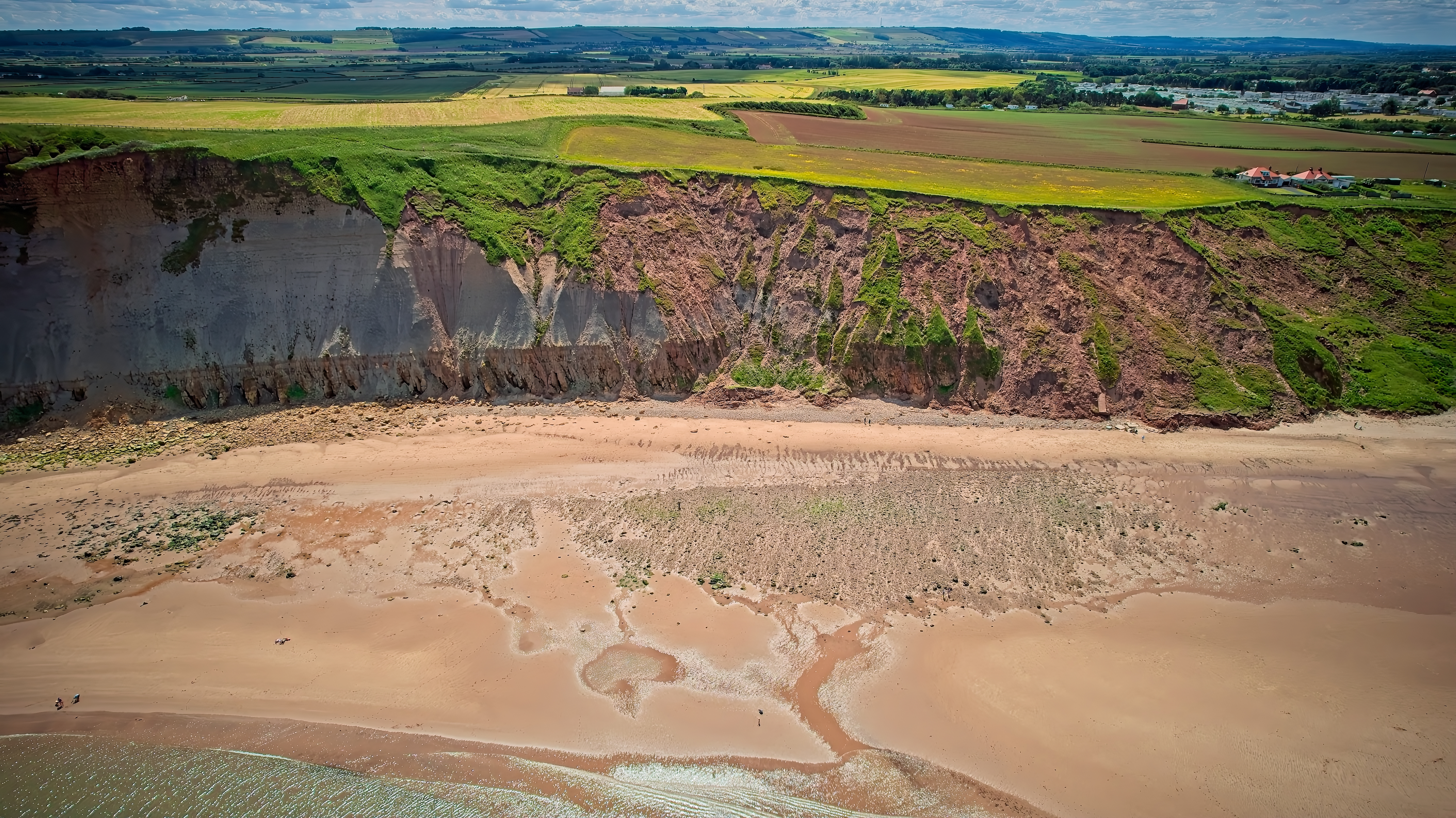 Aerial view of a coastal cliff with green vegetation on top, overlooking a sandy beach with scattered rocks and the sea. Farmland and buildings are visible in the background.