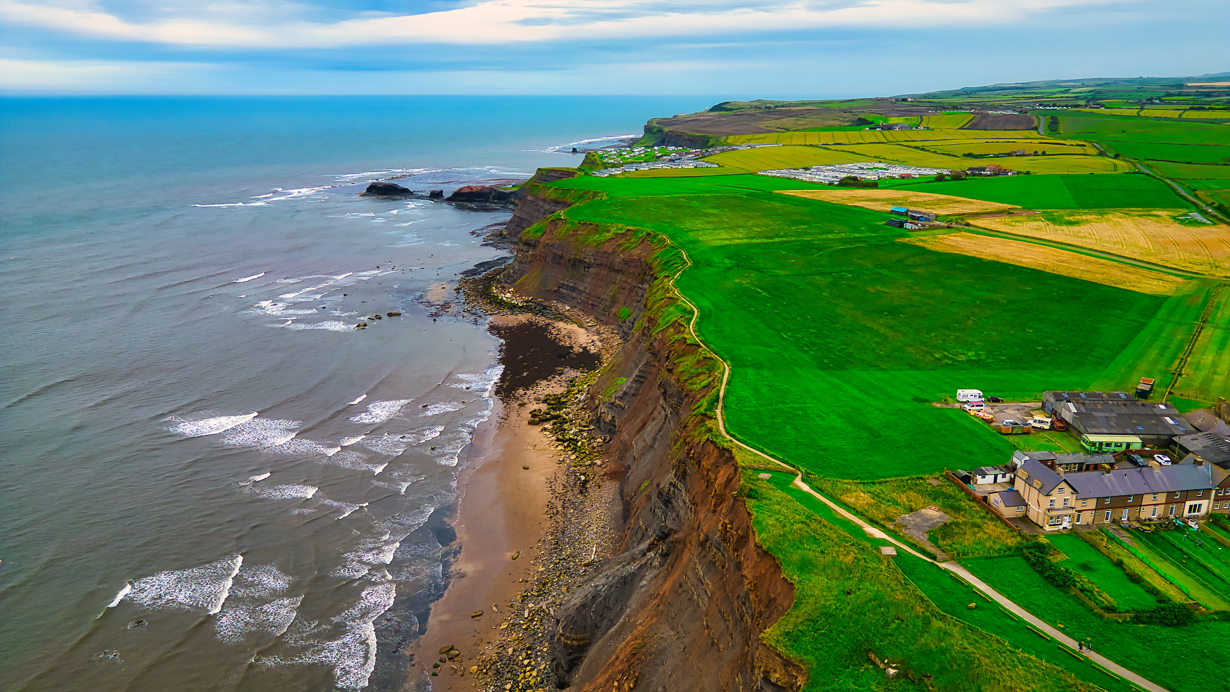 Aerial view of a coastal cliff with green fields and houses on top, overlooking the ocean. Waves crash against the rocky shore below.