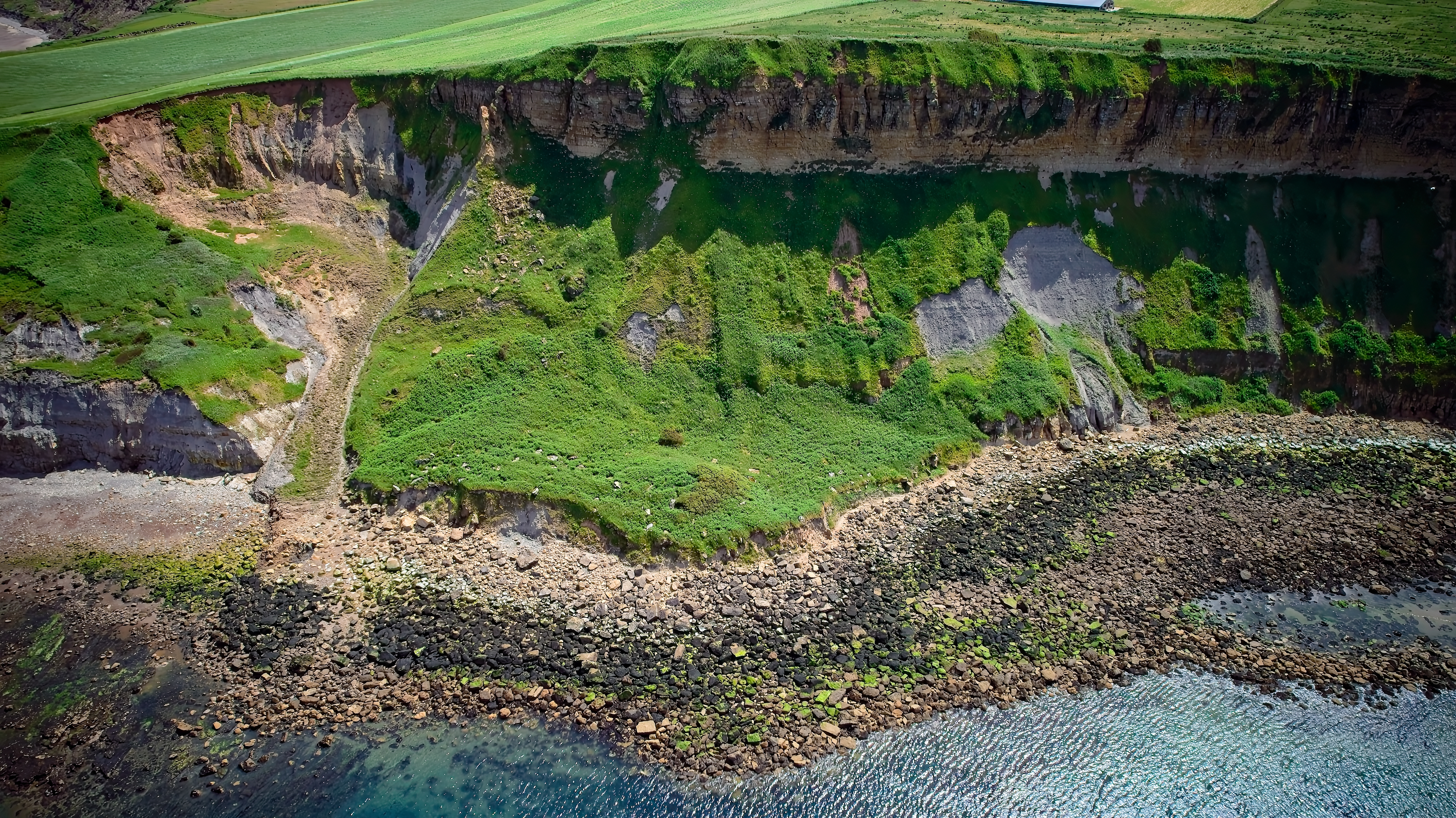 Aerial view of a coastal cliff with green vegetation, rocky shoreline, and clear blue water. The cliff shows signs of erosion and landslides.