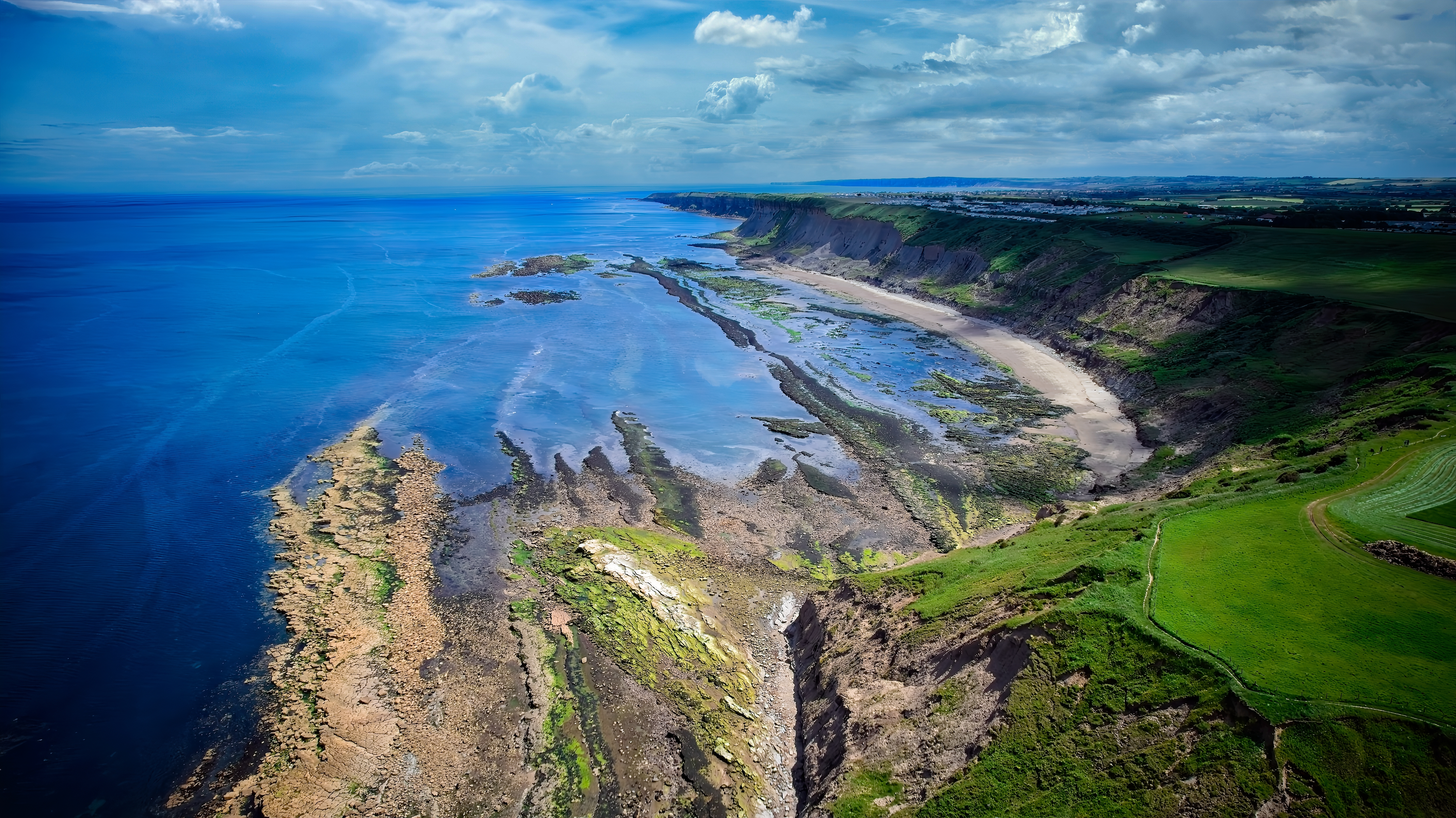 Aerial view of a coastal landscape with cliffs, rocky shoreline, and green fields under a partly cloudy sky.