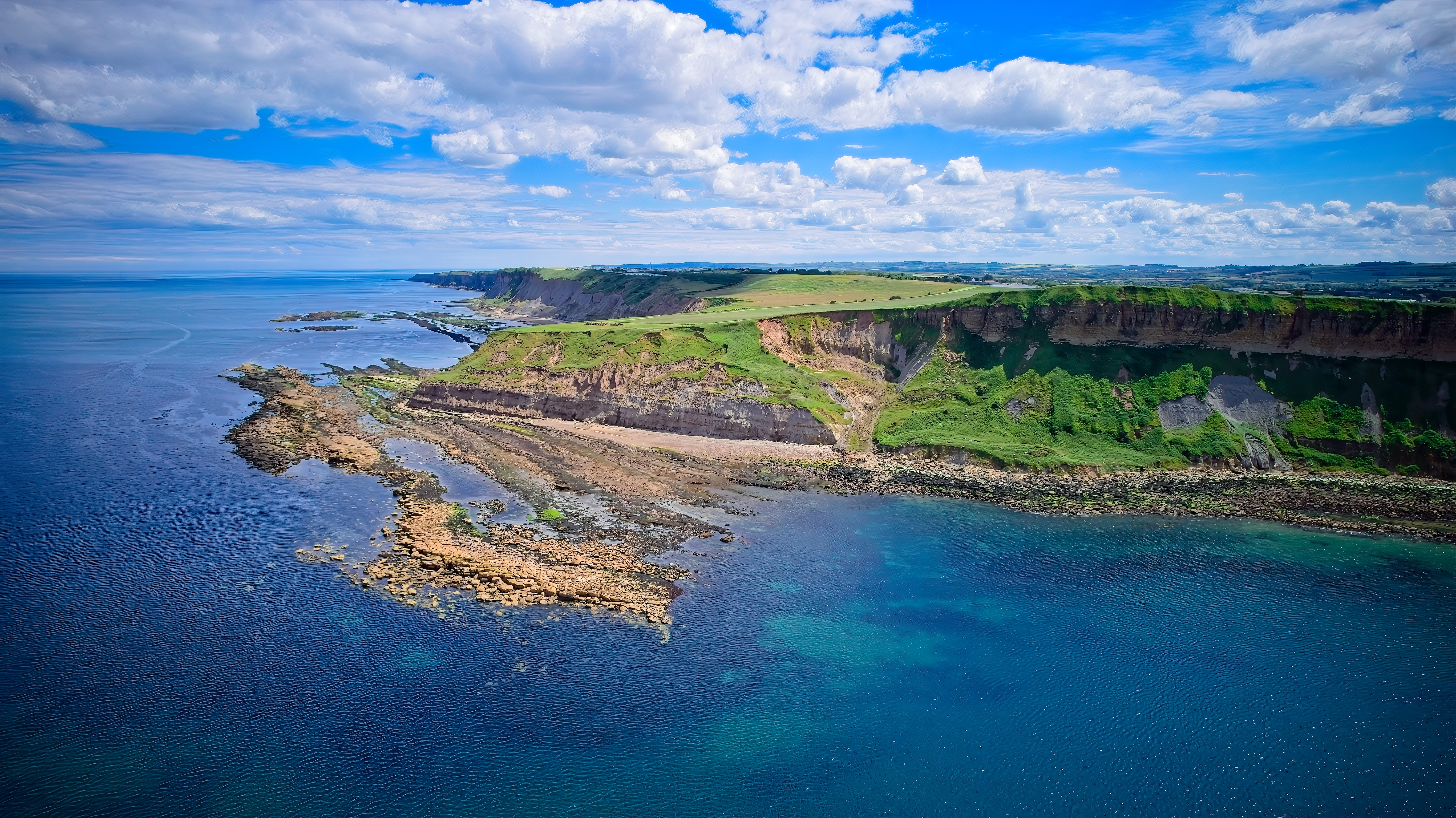 Aerial view of a scenic coastal landscape with cliffs, green fields, and blue ocean under a partly cloudy sky.