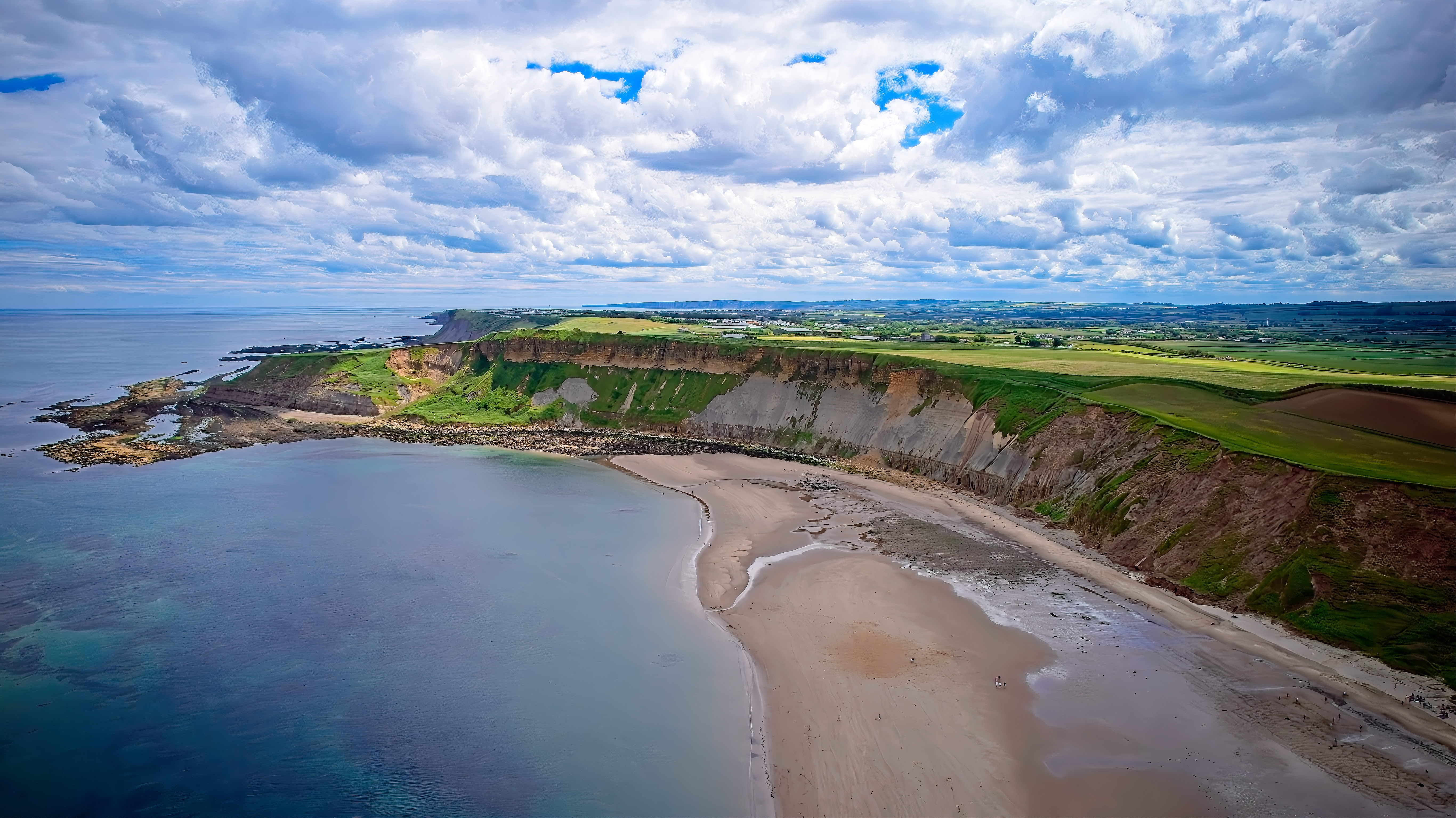 Aerial view of a scenic coastal landscape with cliffs, sandy beach, and calm sea under a partly cloudy sky.