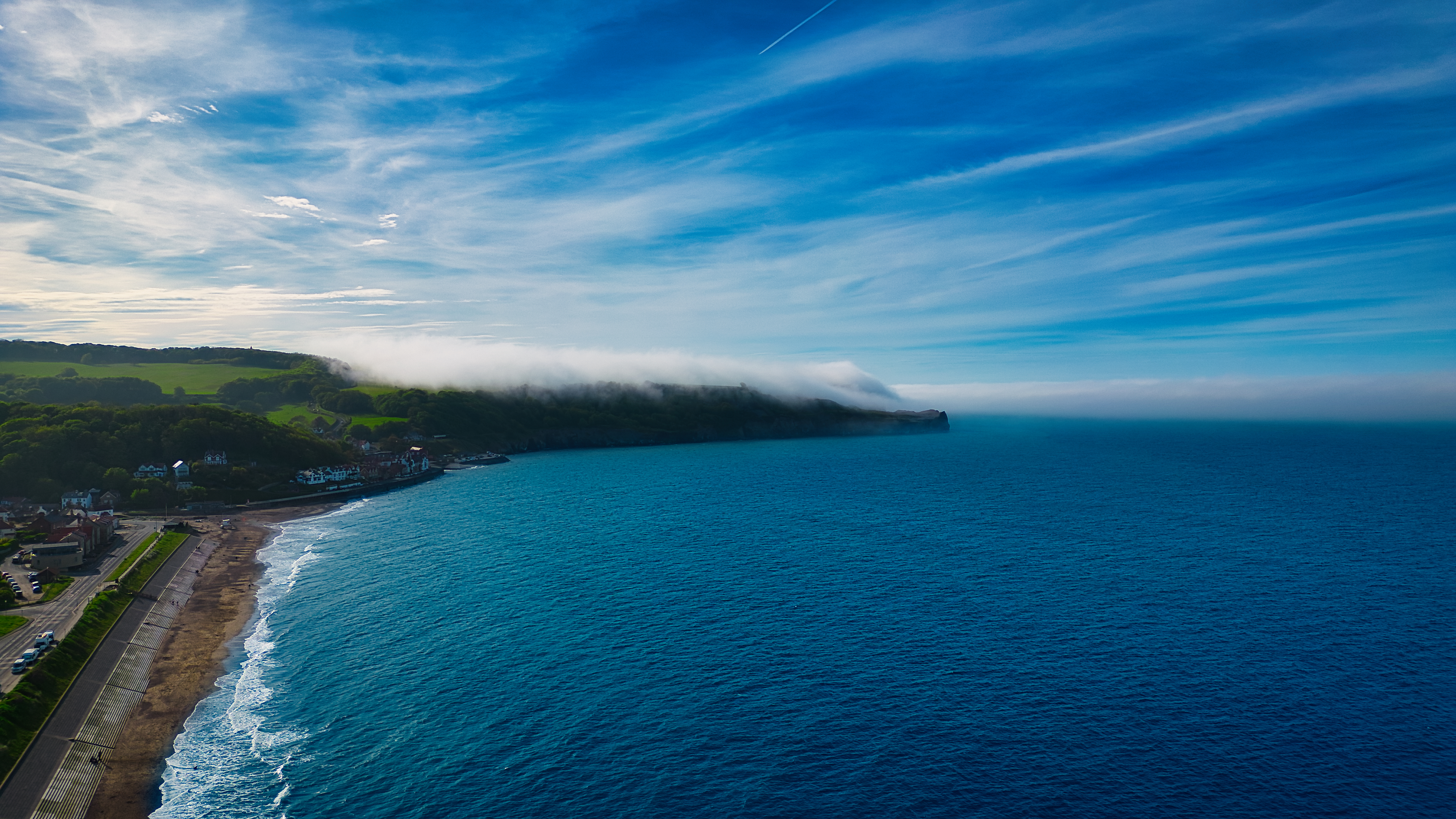 Aerial view of a coastal landscape with a beach, blue ocean, and a headland covered in fog. The sky is clear with some wispy clouds.