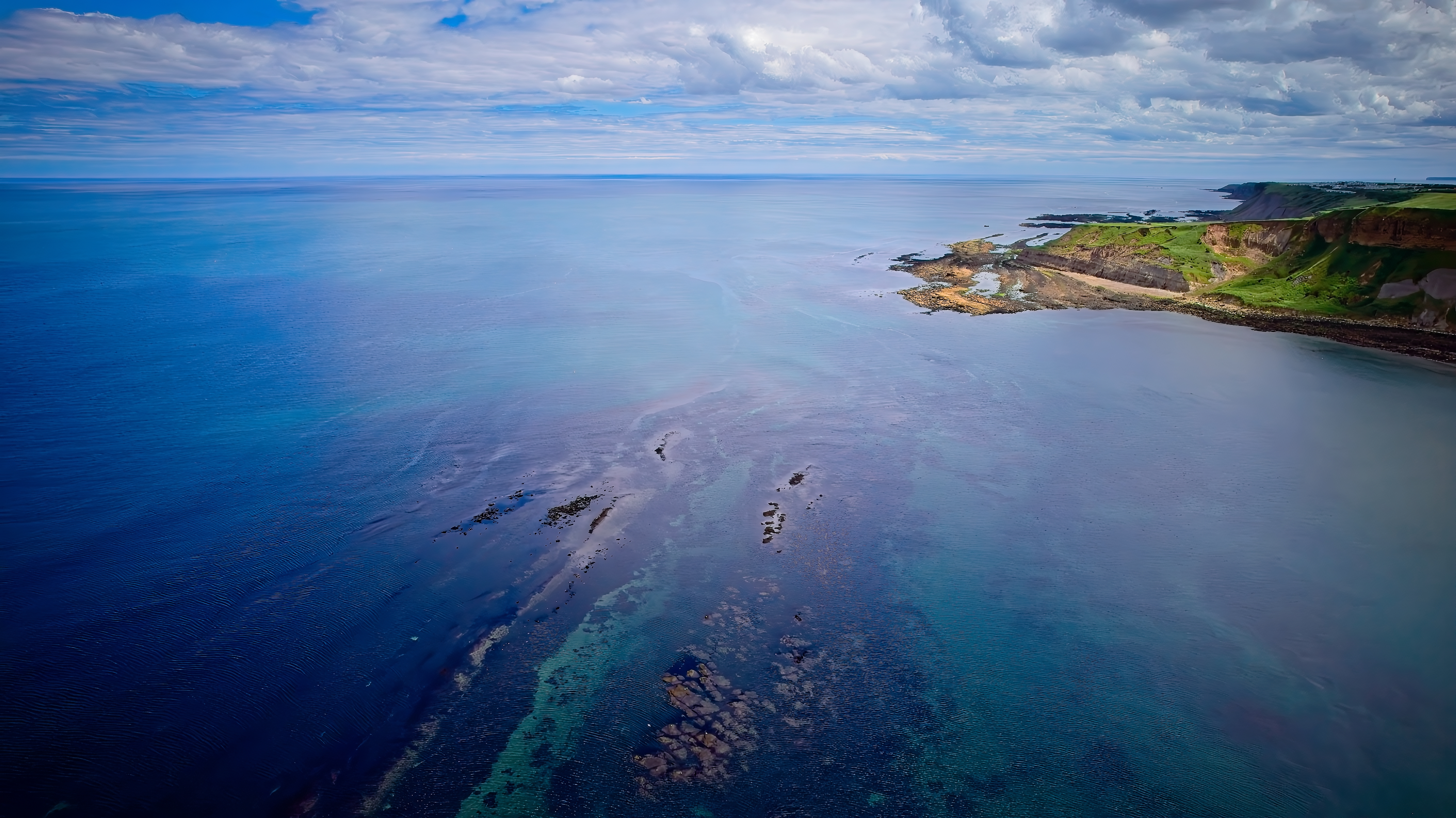 Aerial view of a serene coastal landscape with clear blue waters, rocky shoreline, and green cliffs under a partly cloudy sky.