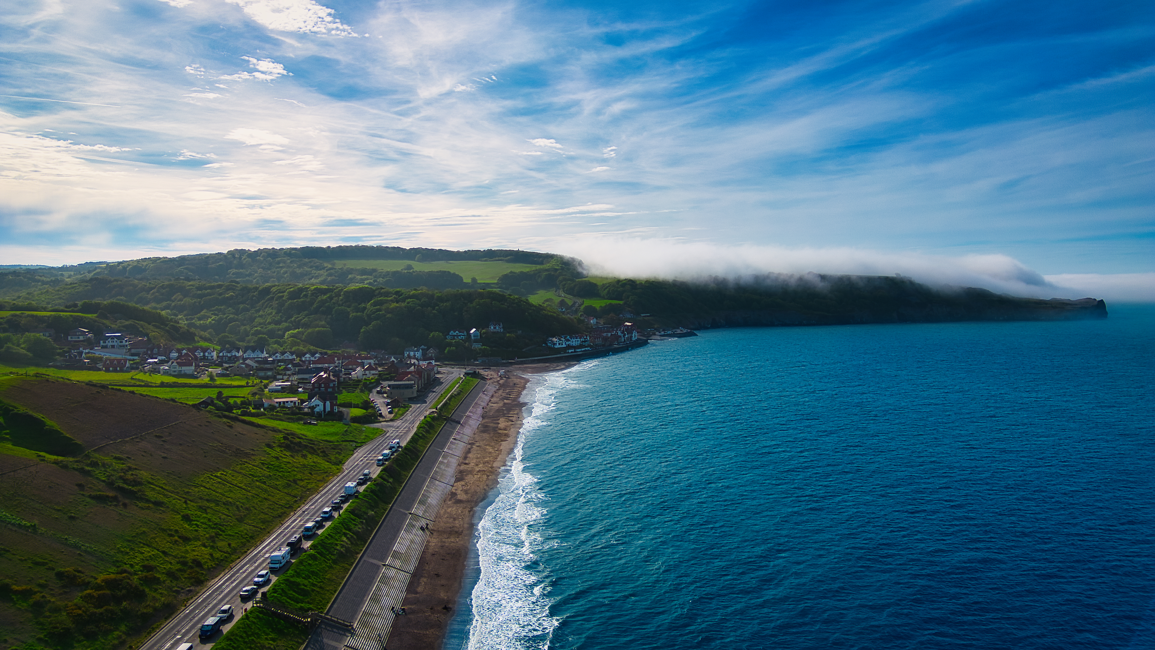 Aerial view of a coastal landscape with a road running parallel to the shoreline, houses, green hills, and a misty horizon over the ocean.
