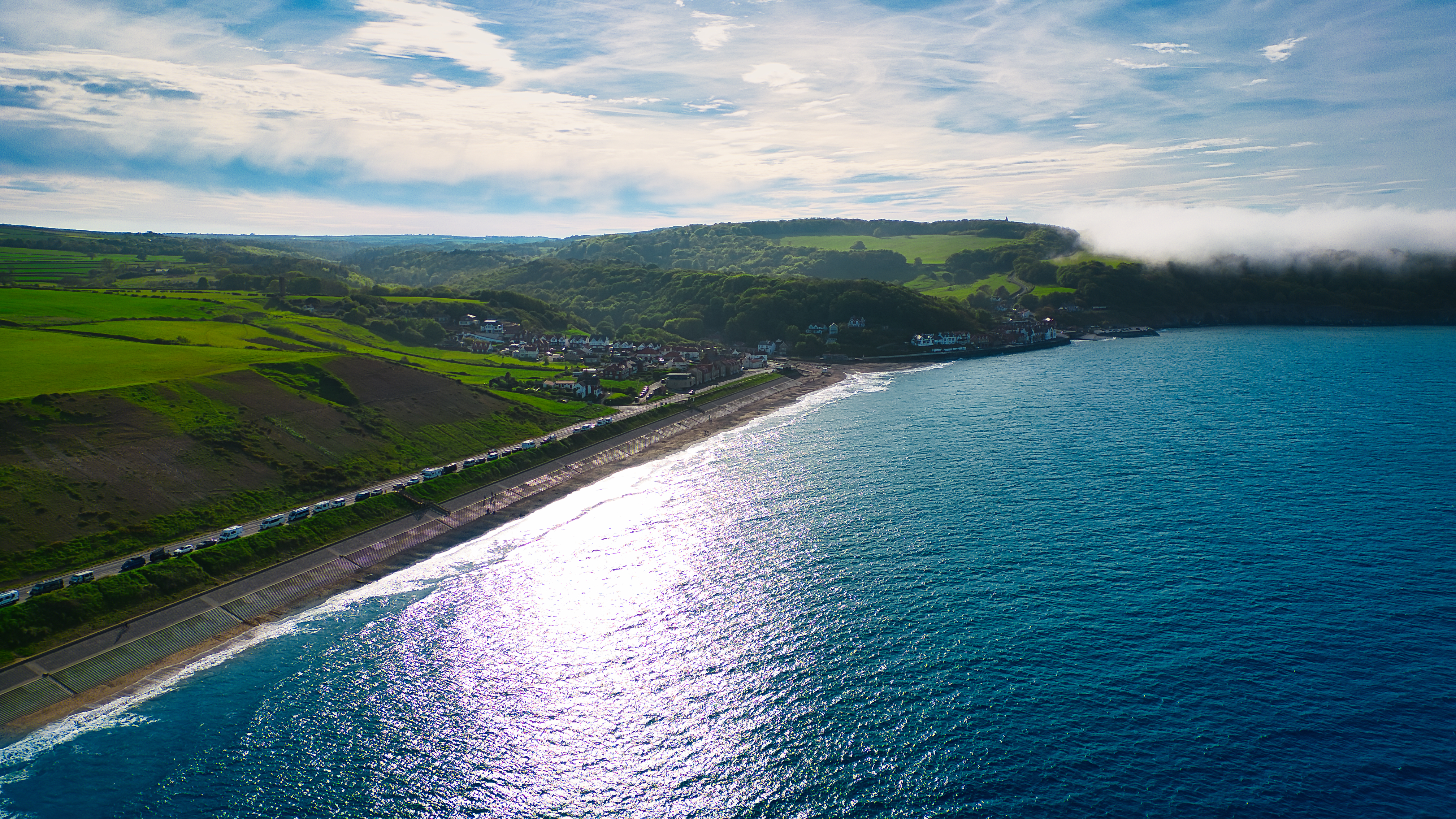 Aerial view of a coastal landscape with a road running parallel to the shoreline, green fields, and a small town. The ocean is calm with a clear sky above.