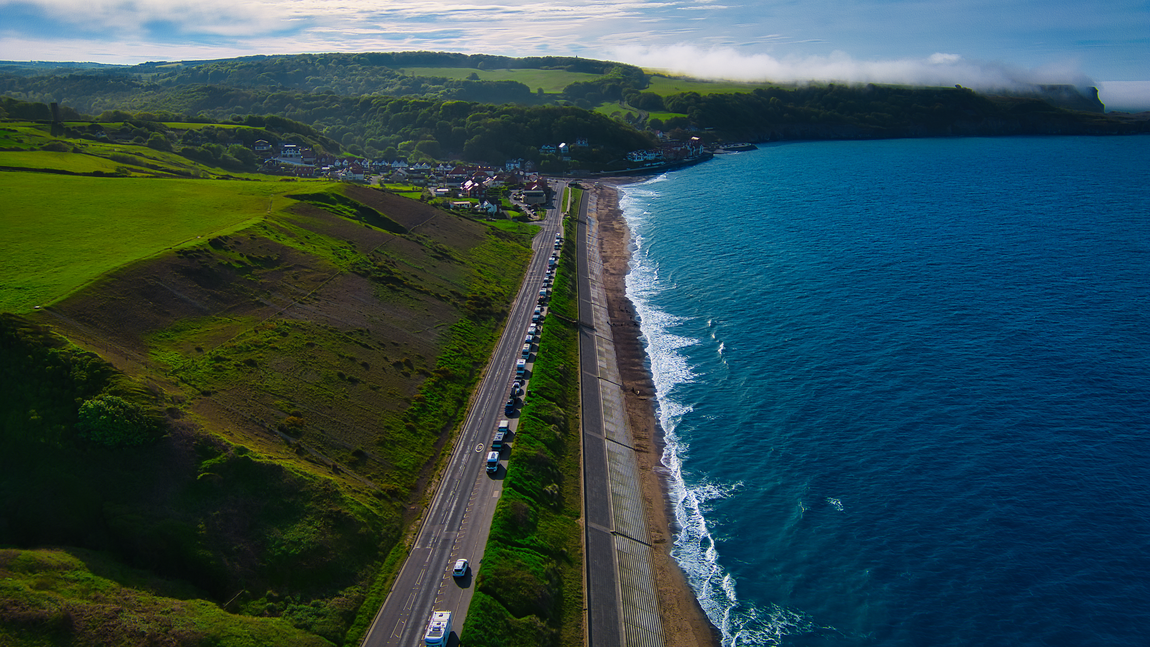 Aerial view of a coastal road with cars, adjacent to a beach and ocean on one side and green hills on the other. The sky is partly cloudy with a layer of fog over the hills in the background.