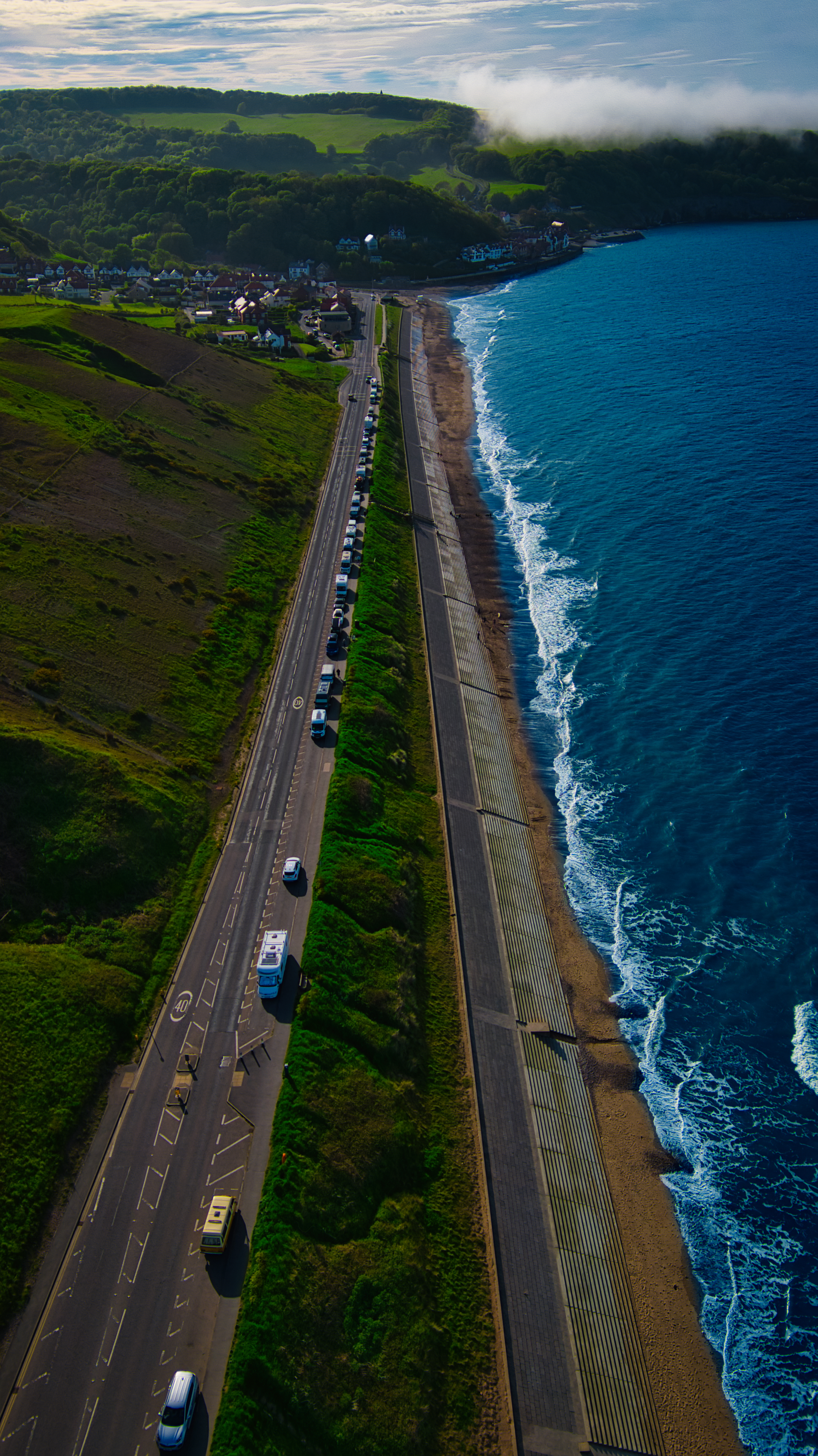 Aerial view of a coastal road with cars, adjacent to a beach and ocean waves. The road is lined with greenery and leads to a small town with houses and trees. The sky is partly cloudy.