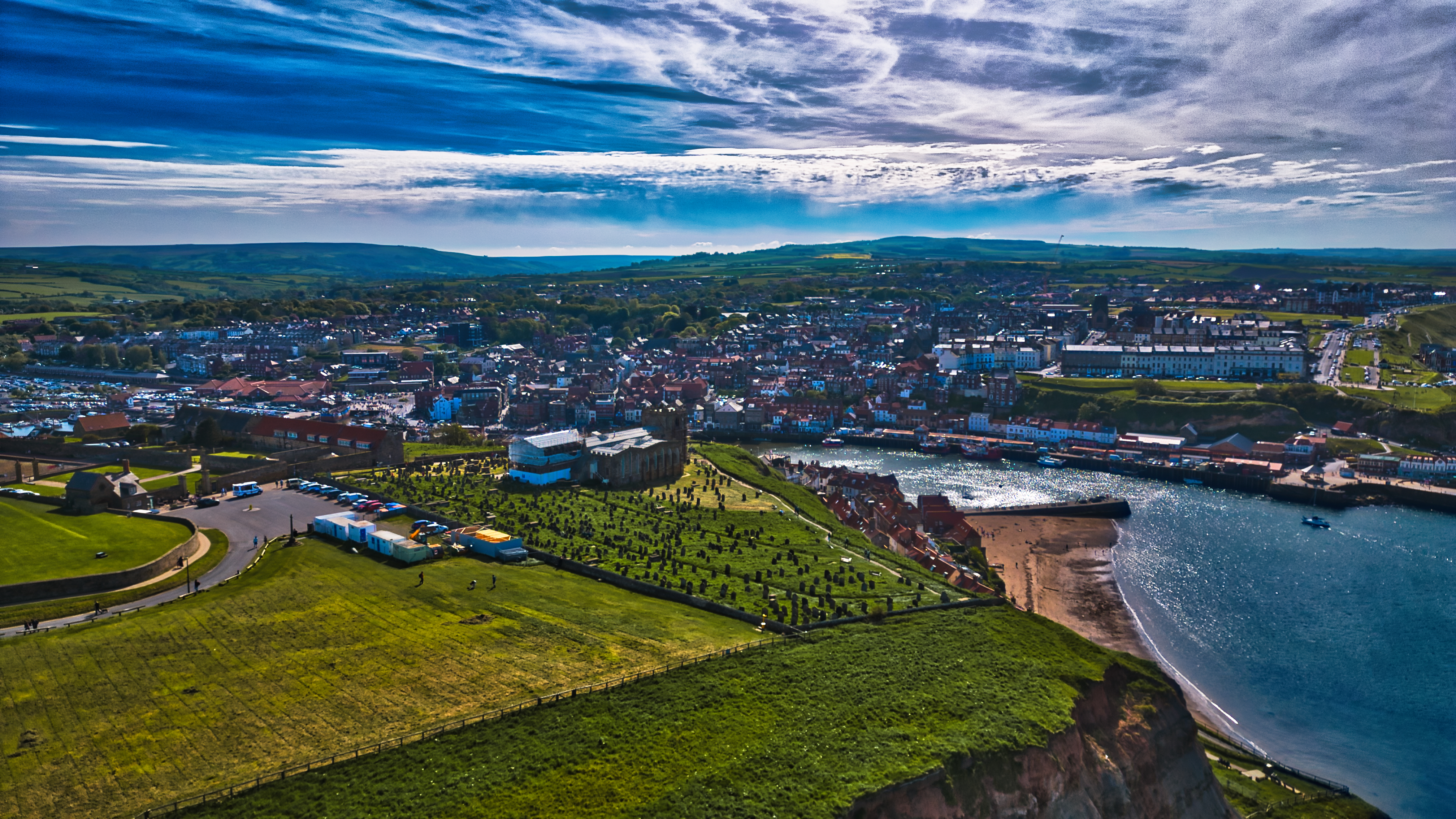 Aerial view of a coastal town with a harbor, green fields, and a cemetery. The town is surrounded by lush green hills and has a mix of residential and commercial buildings. The sky is partly cloudy with a dramatic cloud formation.