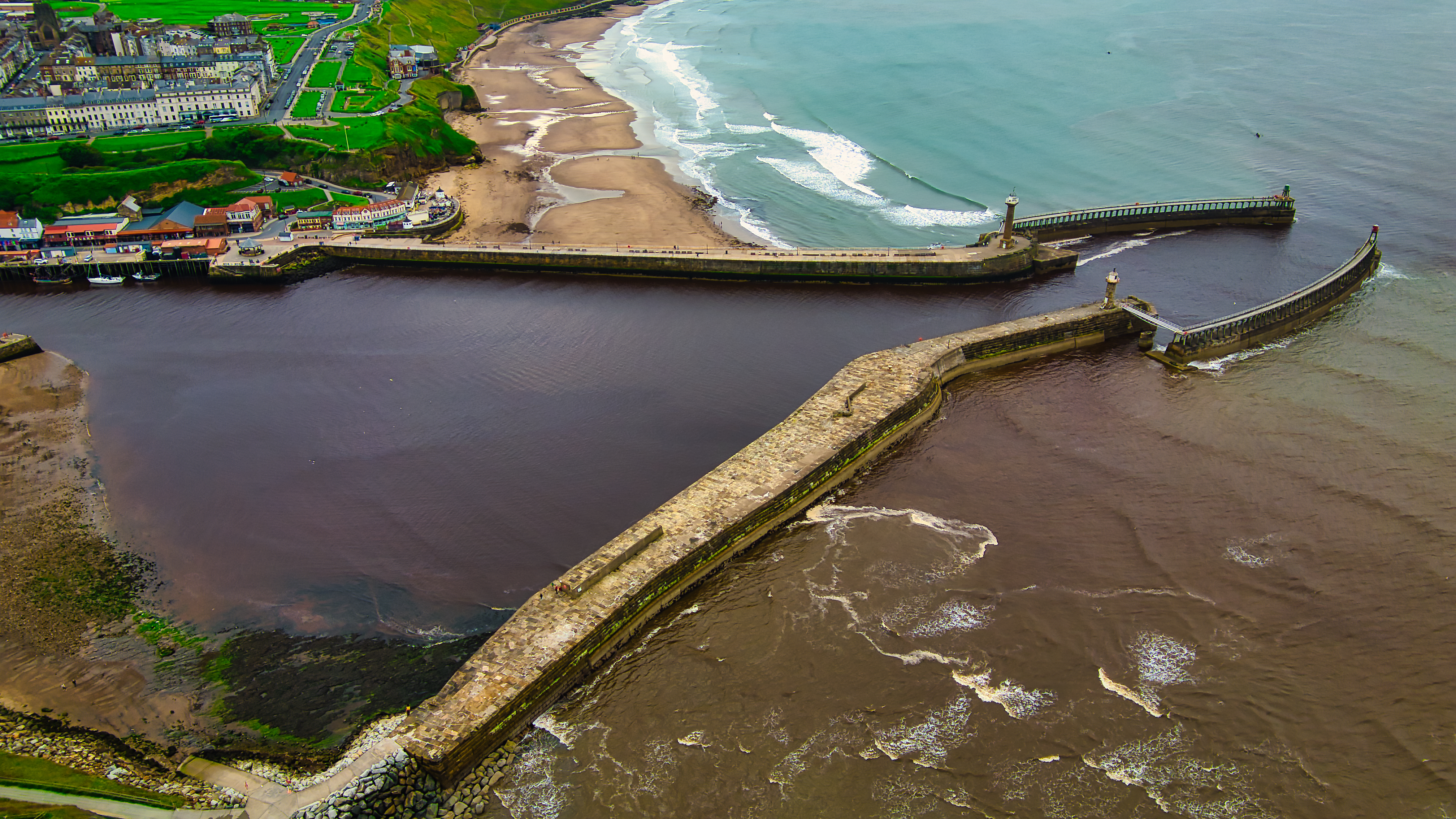 Aerial view of a coastal town with a pier extending into the sea. The town has a beach, buildings, and green areas. The sea is calm with gentle waves.