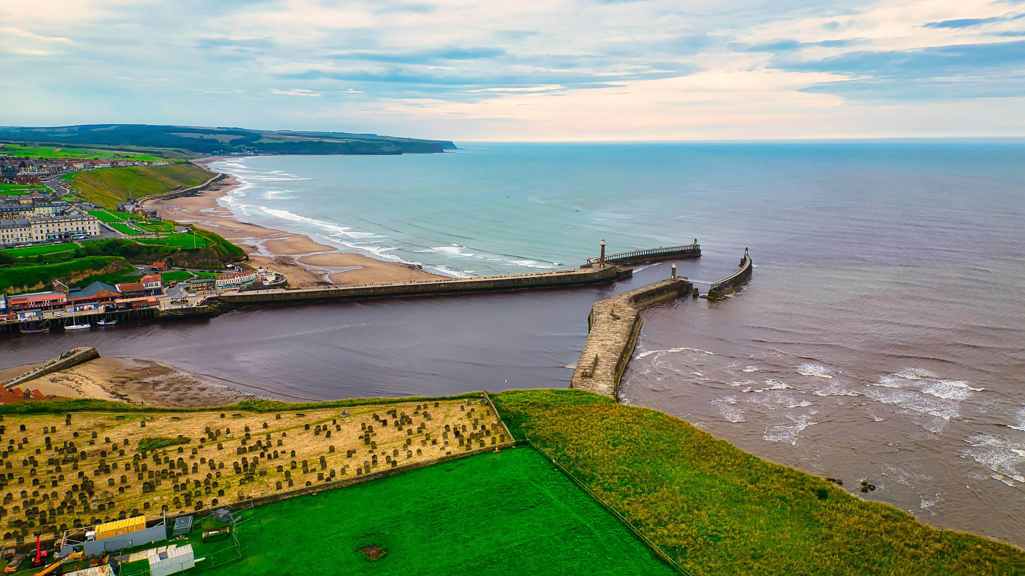 Aerial view of a coastal town with a pier extending into the sea, surrounded by green fields and a sandy beach.