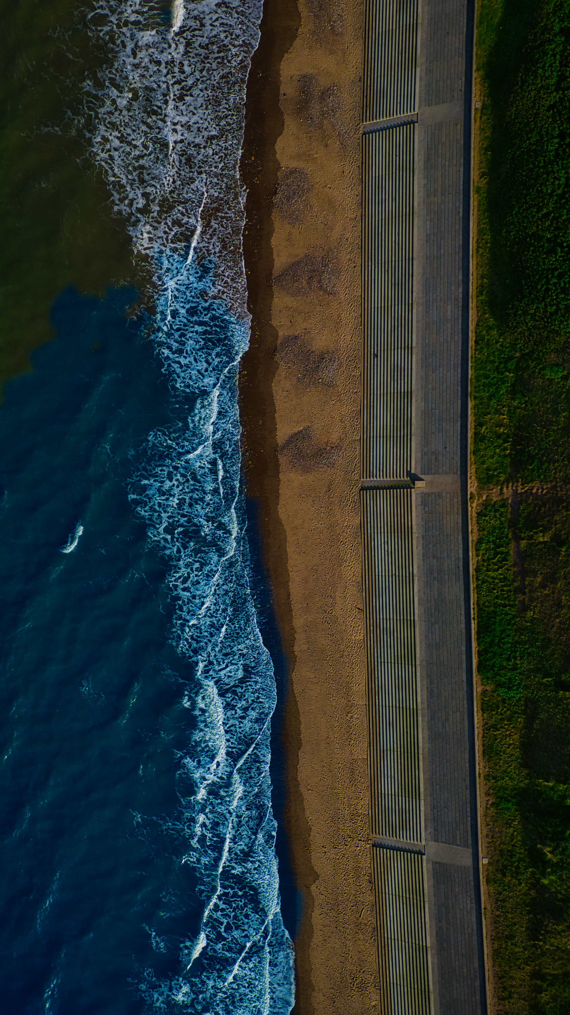 Aerial view of a coastline with waves crashing onto the shore, a sandy beach, and a concrete walkway with steps. Green vegetation is visible on the right side.