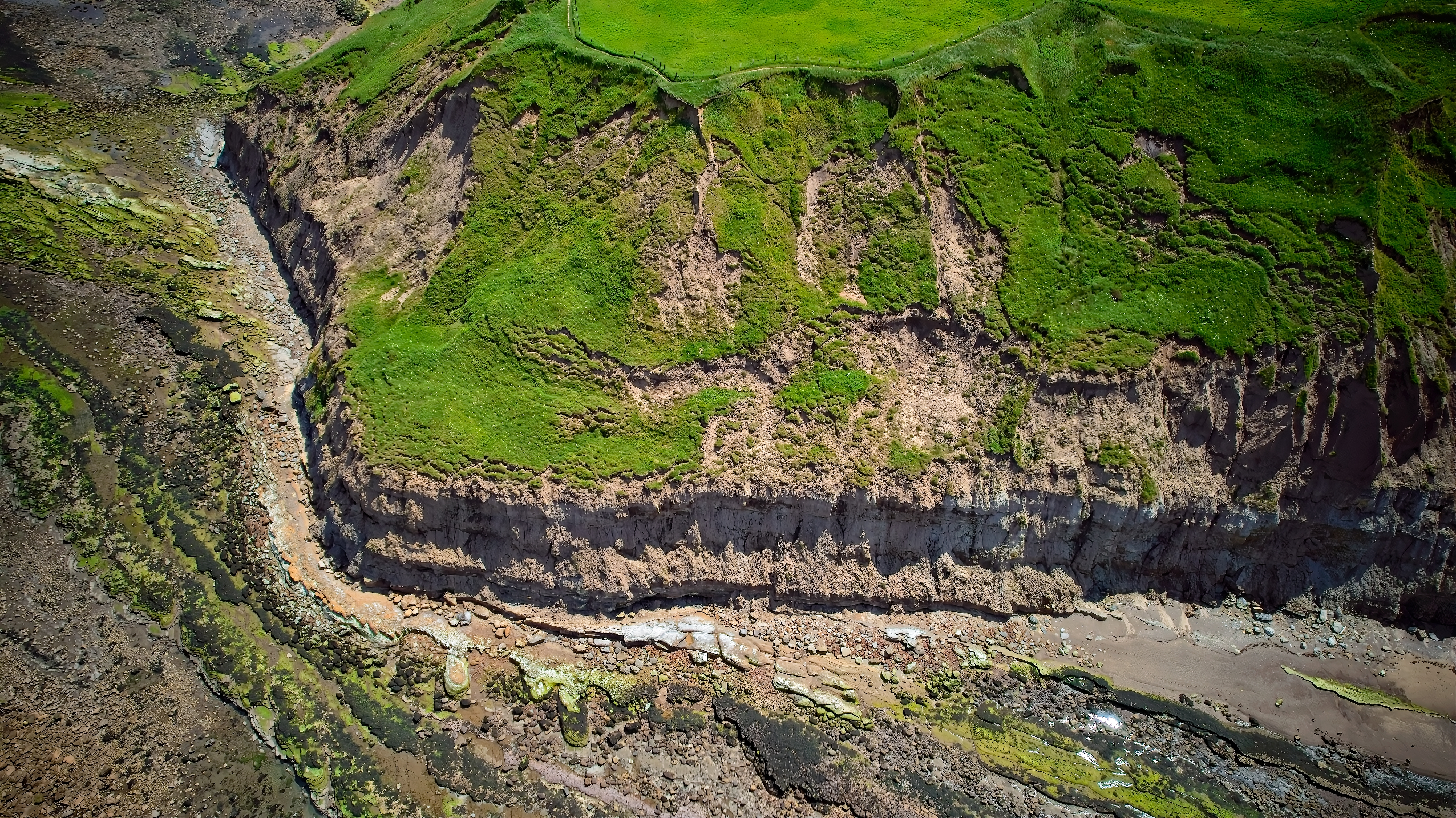 Aerial view of a rugged coastline with green cliffs and rocky shore.