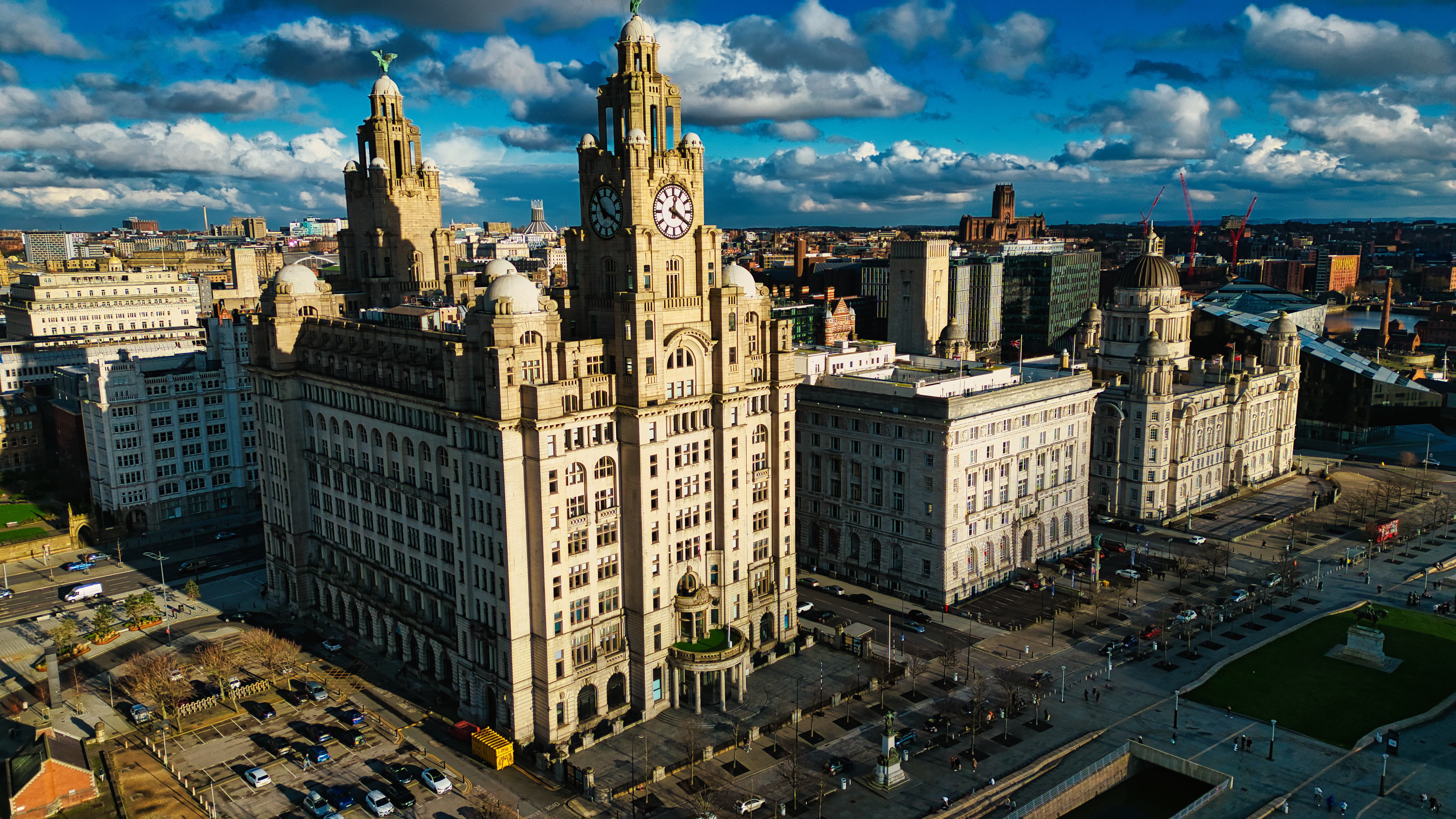 Aerial view of historic urban architecture with iconic buildings under a cloudy sky in Liverpool, UK.
