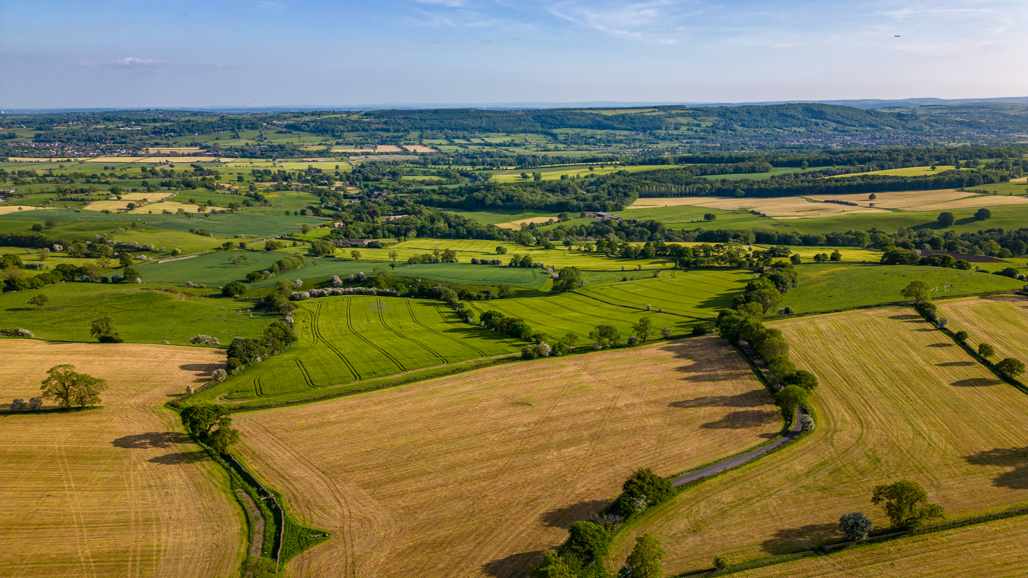 Aerial view of lush green and golden agricultural fields with patchwork patterns under a clear sky.