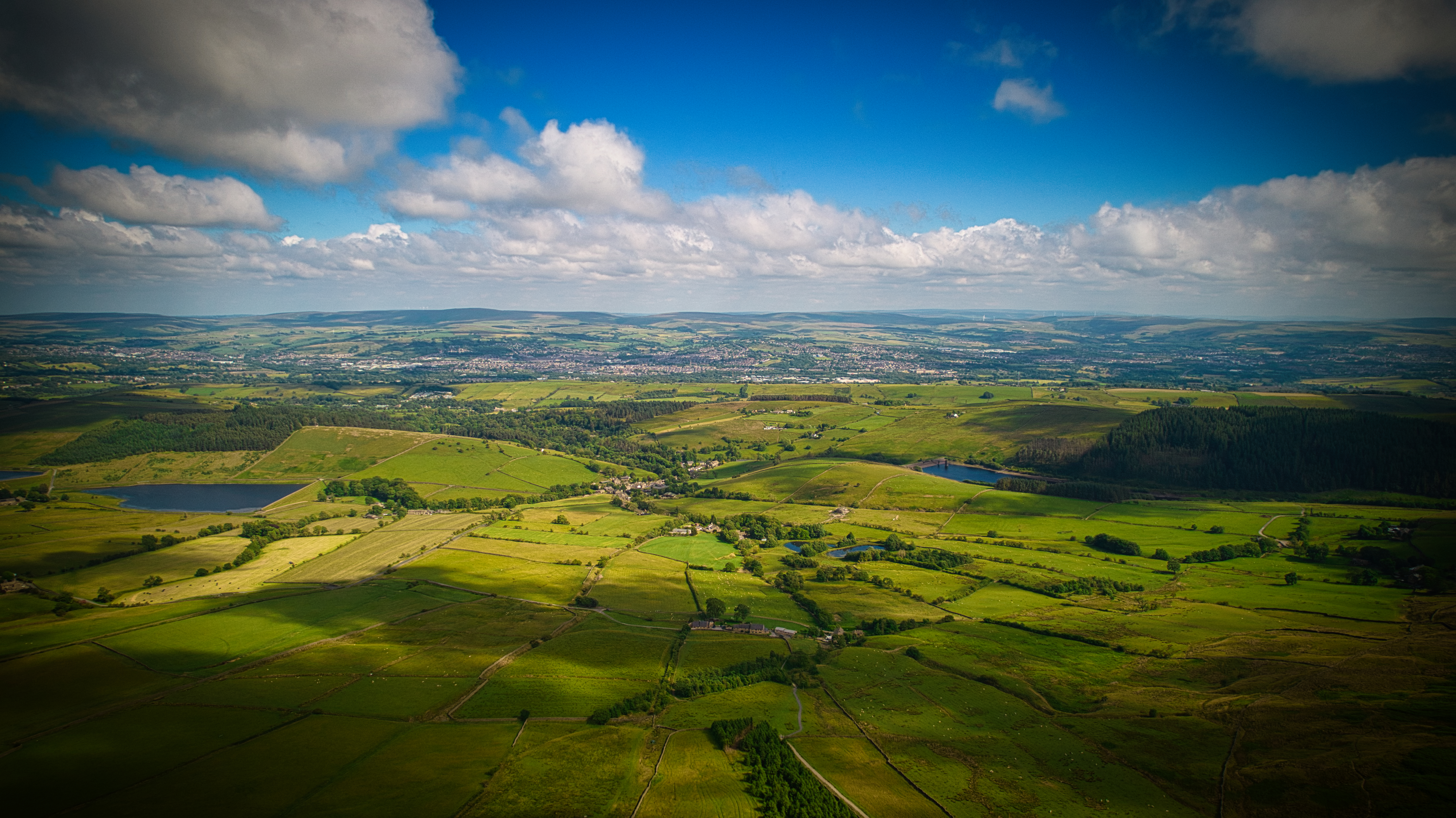 Aerial view of lush green countryside with fields, trees, and a lake under a partly cloudy sky in Pendle Hill, England.