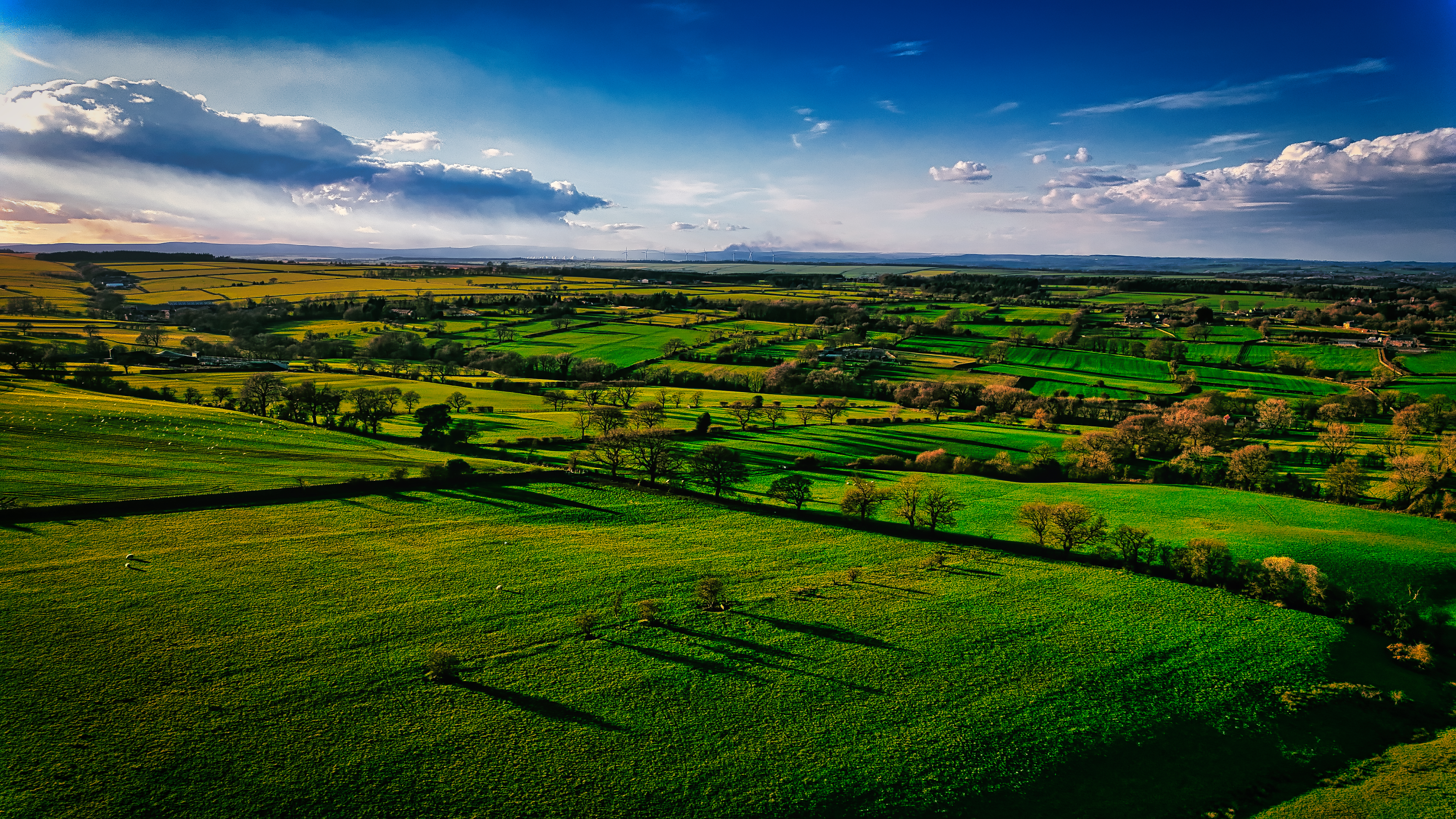 Aerial view of lush green countryside with fields and shadows cast by clouds, showcasing rural beauty in North Yorkshire.