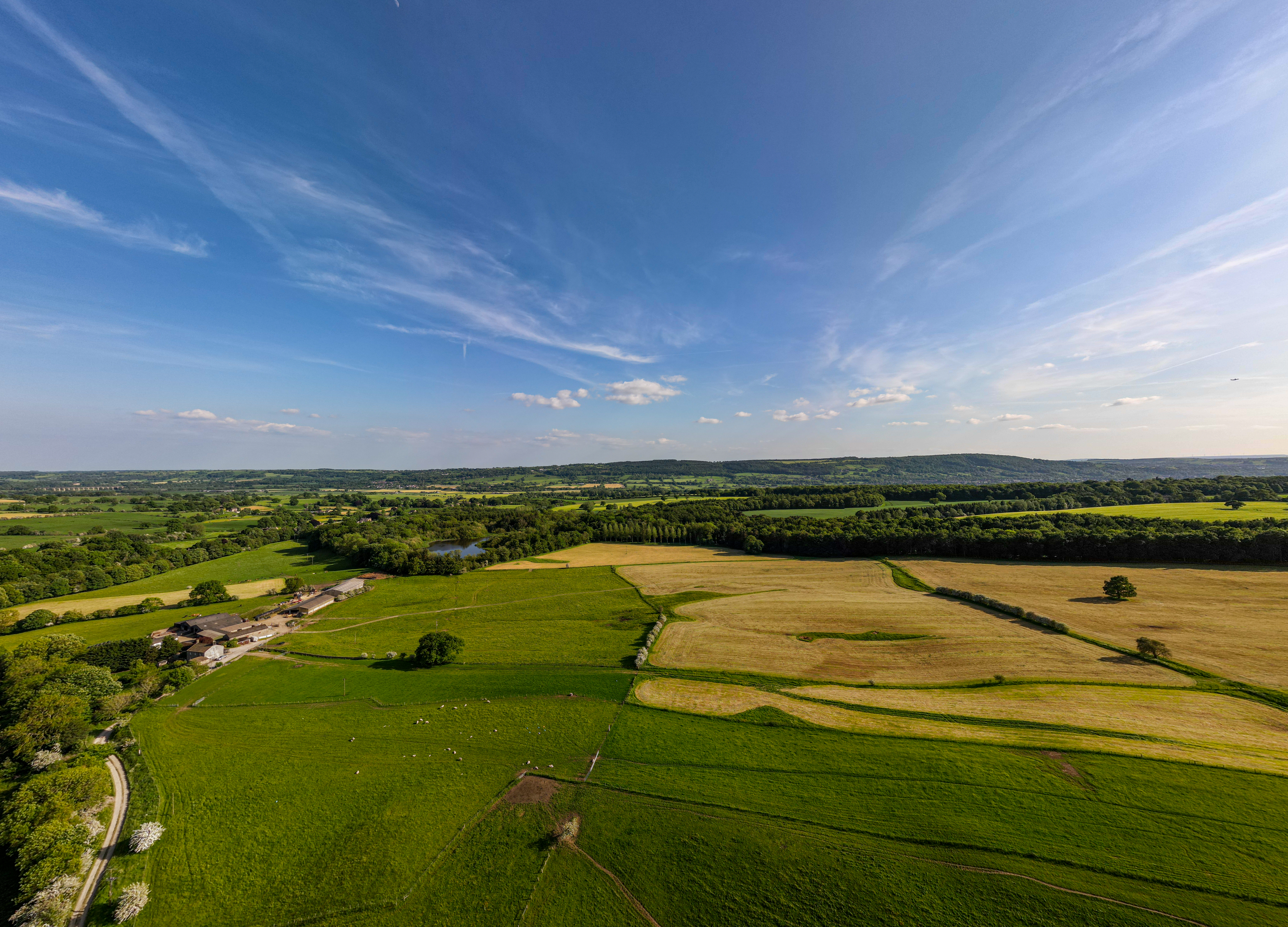 Aerial view of lush green countryside with fields and trees under a blue sky with radiating clouds.