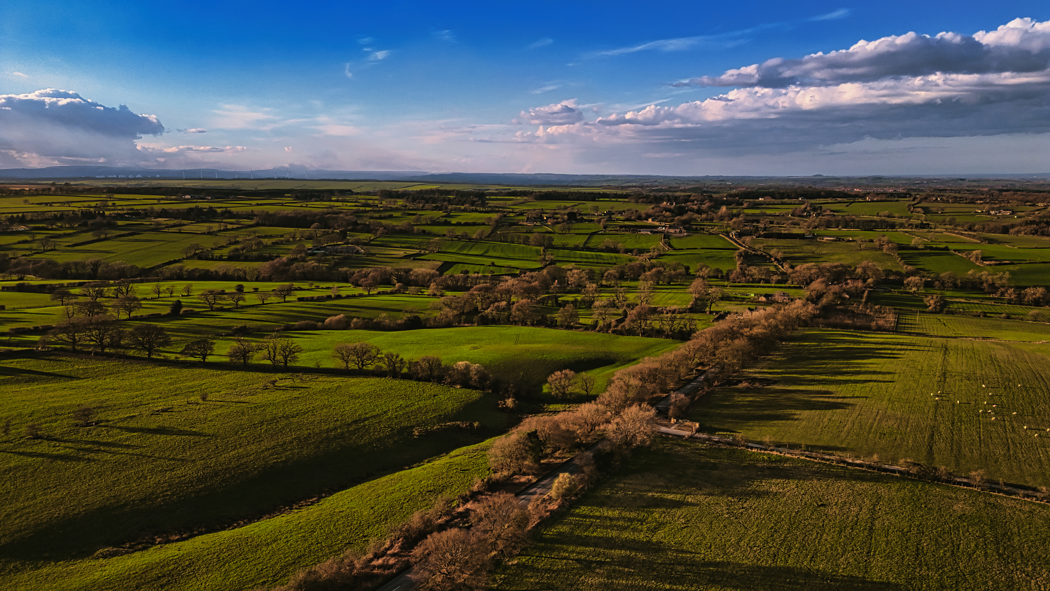 Aerial view of lush green countryside with fields and trees under a blue sky with scattered clouds in North Yorkshire.