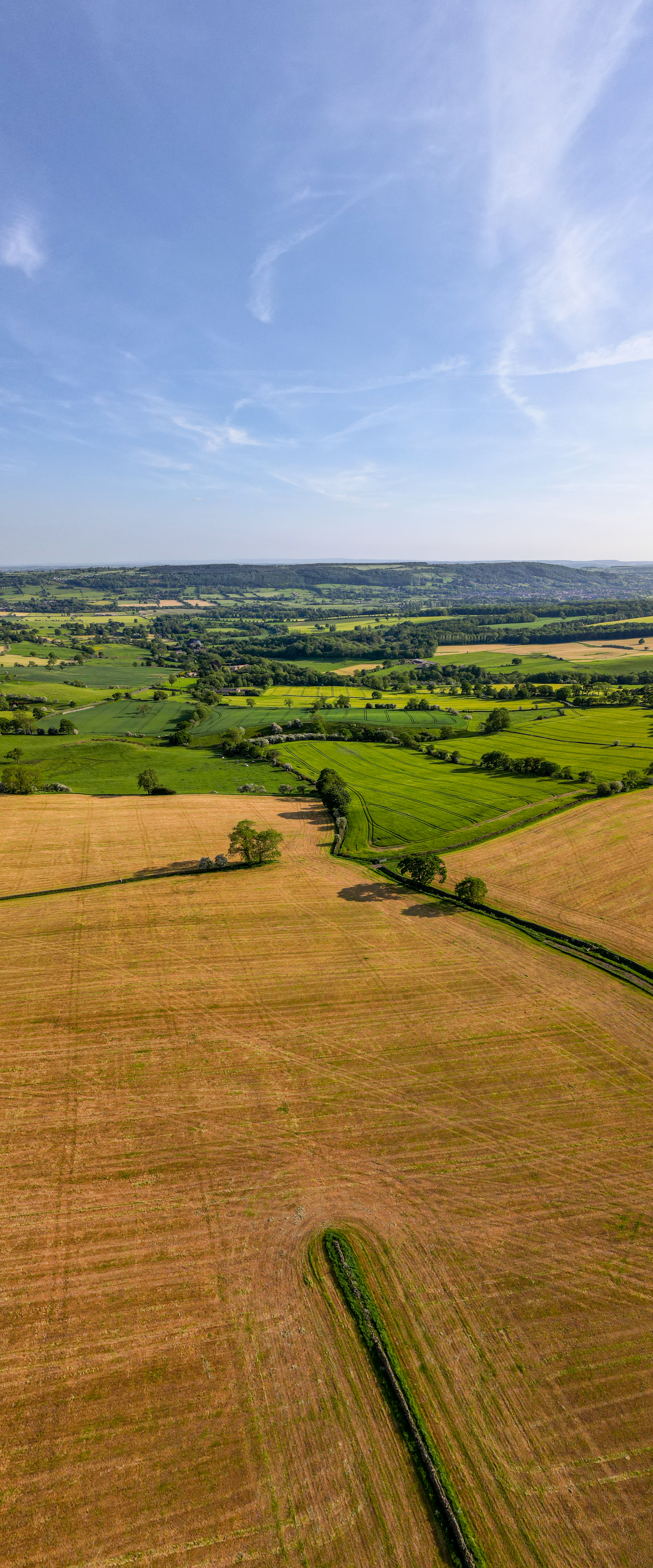 Aerial view of lush green countryside with patchwork fields under a clear blue sky.
