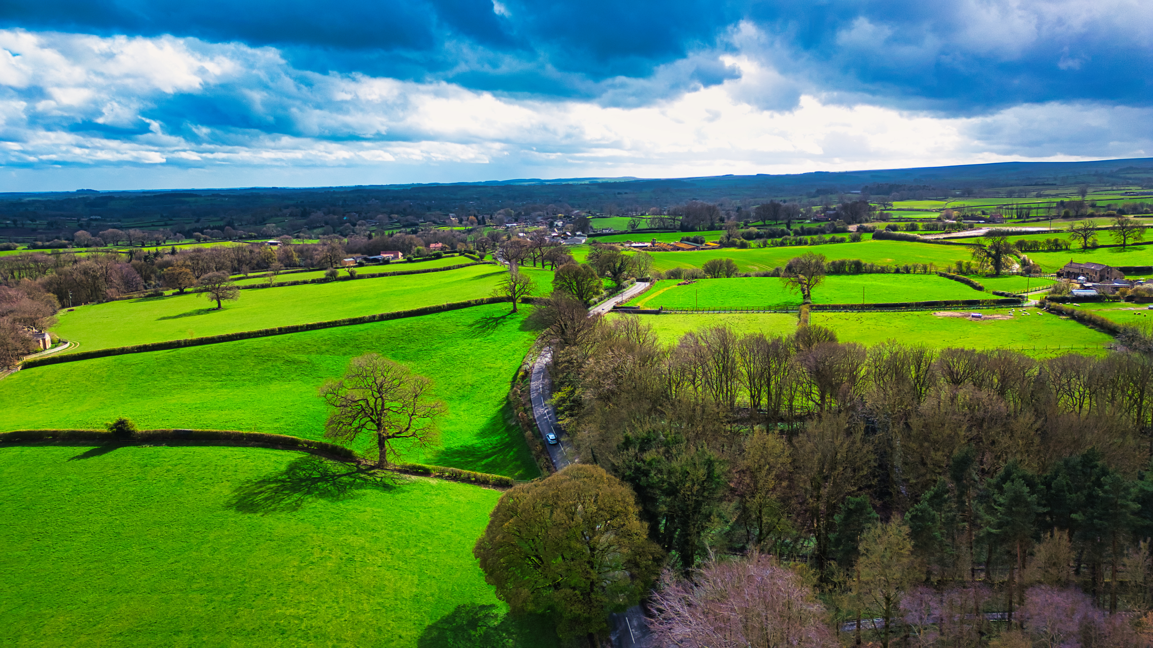 Aerial view of lush green countryside with patchwork fields under a partly cloudy sky.