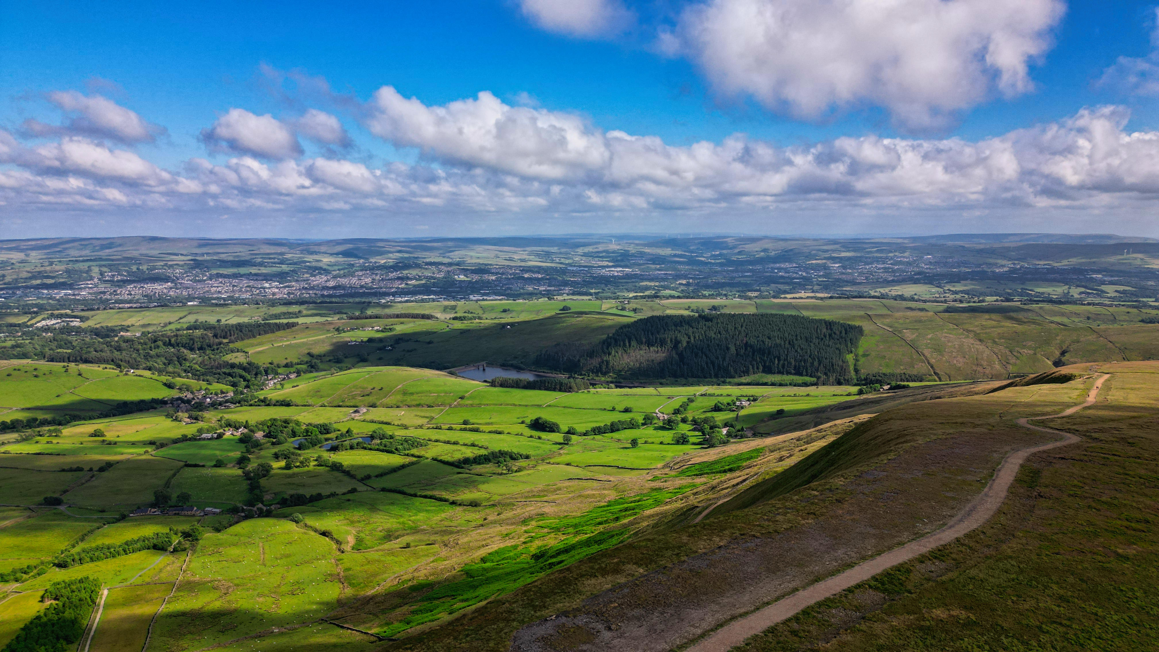 Aerial view of lush green countryside with rolling hills, a lake, and a clear sky with scattered clouds in Pendle Hill, England.