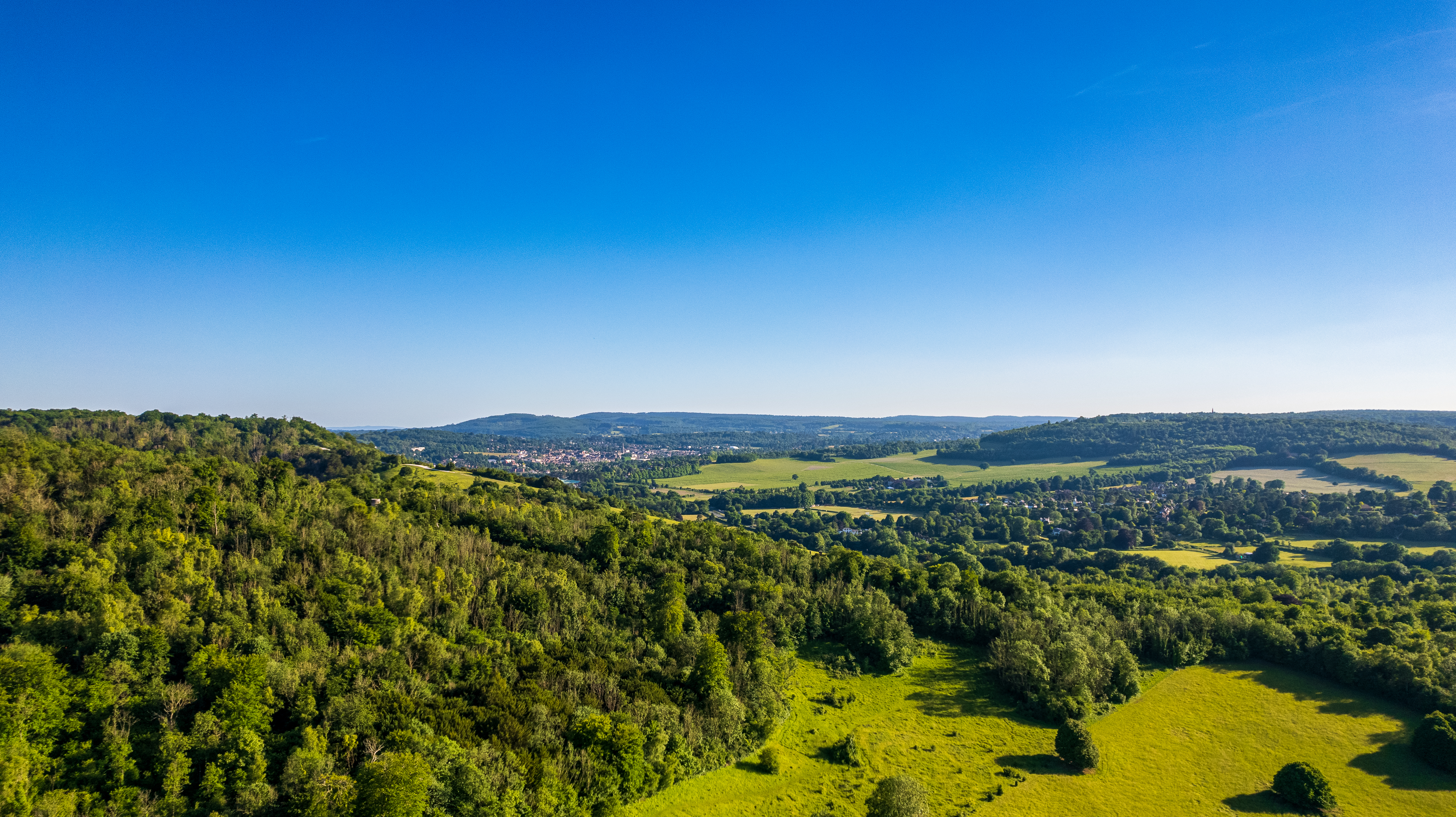 Aerial view of lush green countryside with rolling hills and forests under a clear blue sky.