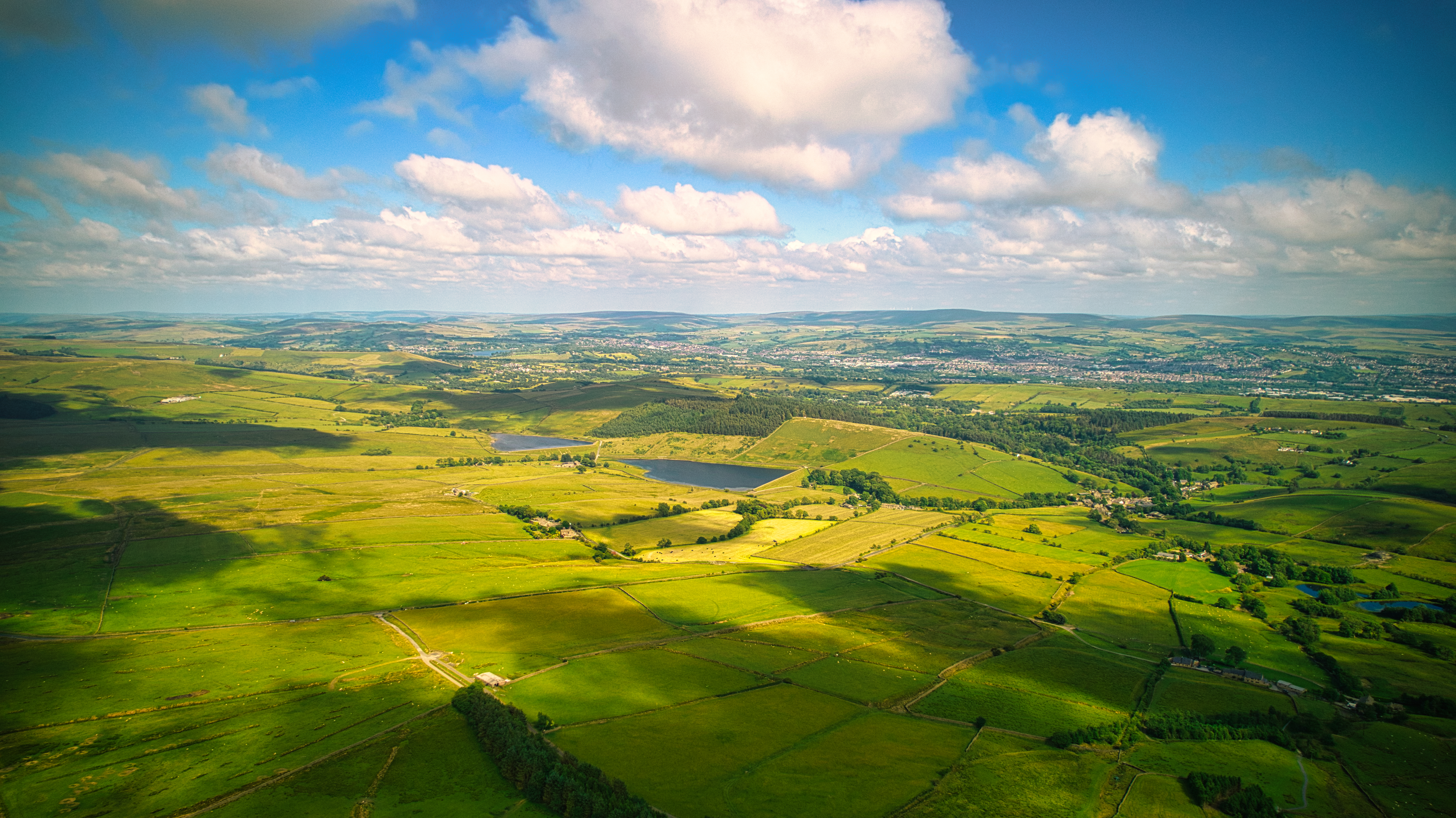 Aerial view of lush green countryside with rolling hills and patchwork fields under a cloudy sky in Pendle Hill, England.