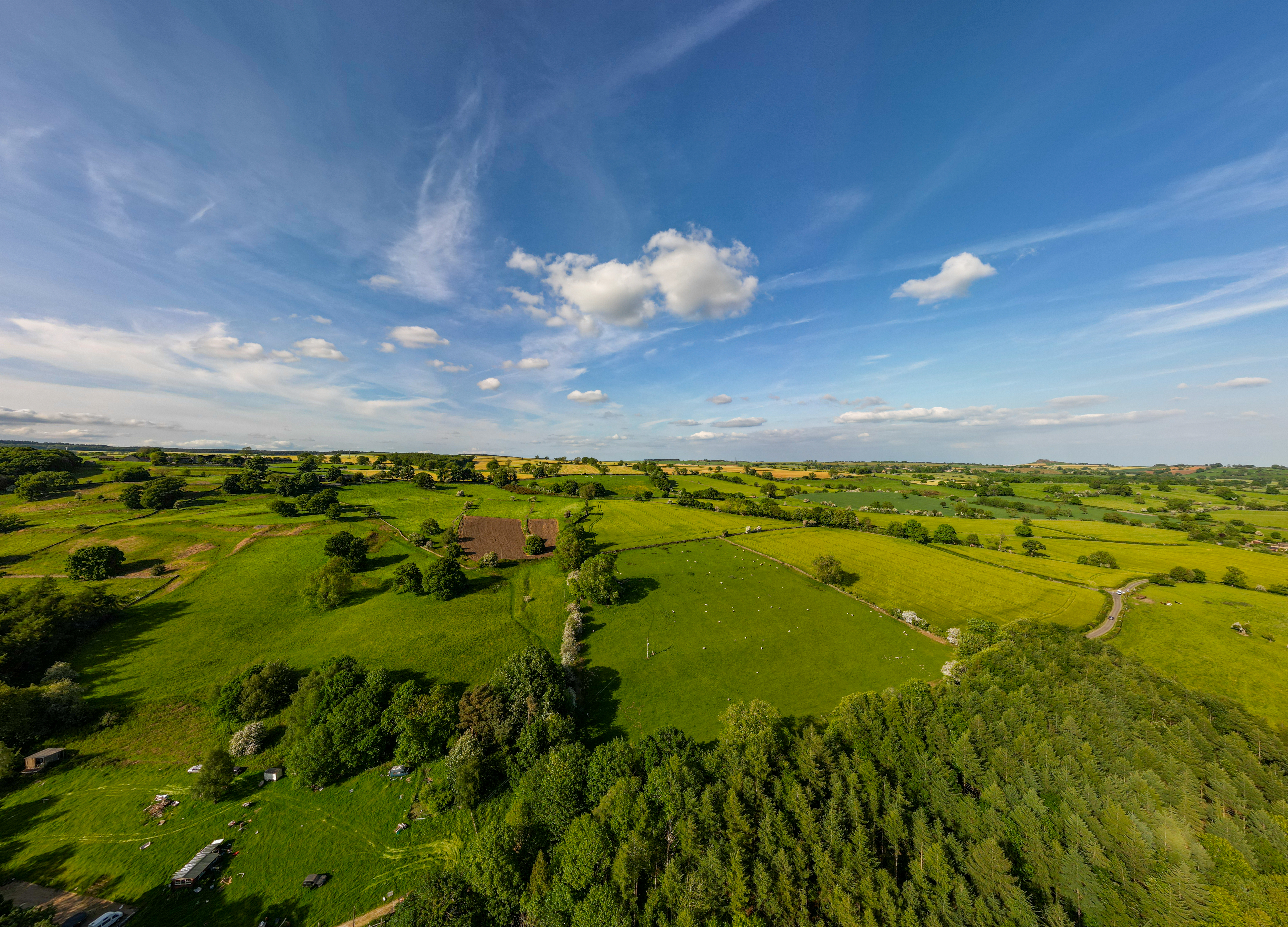 Aerial view of lush green countryside with scattered trees under a blue sky with fluffy clouds.