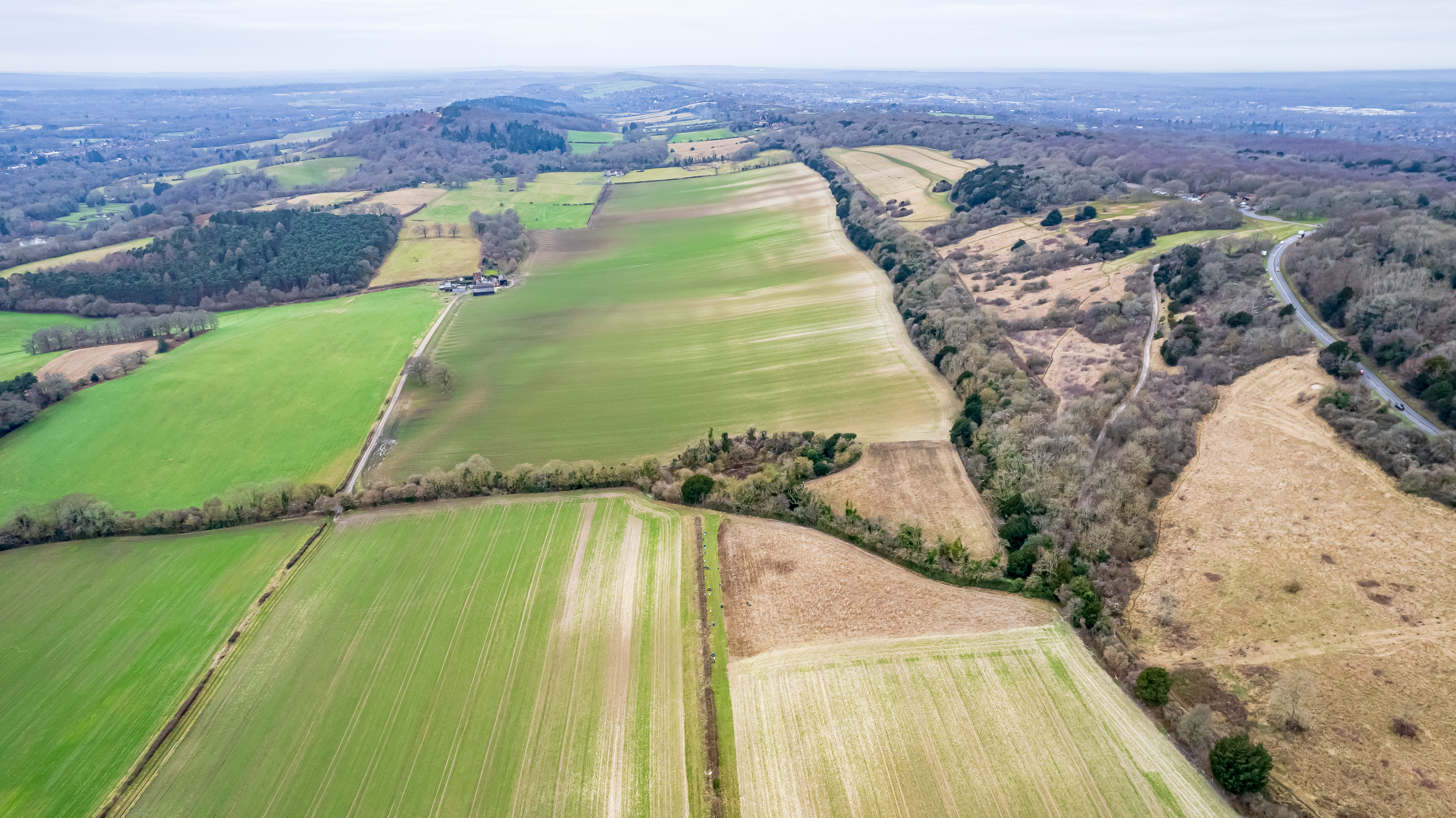 Aerial view of lush green farmland with patchwork fields and trees, under a cloudy sky.