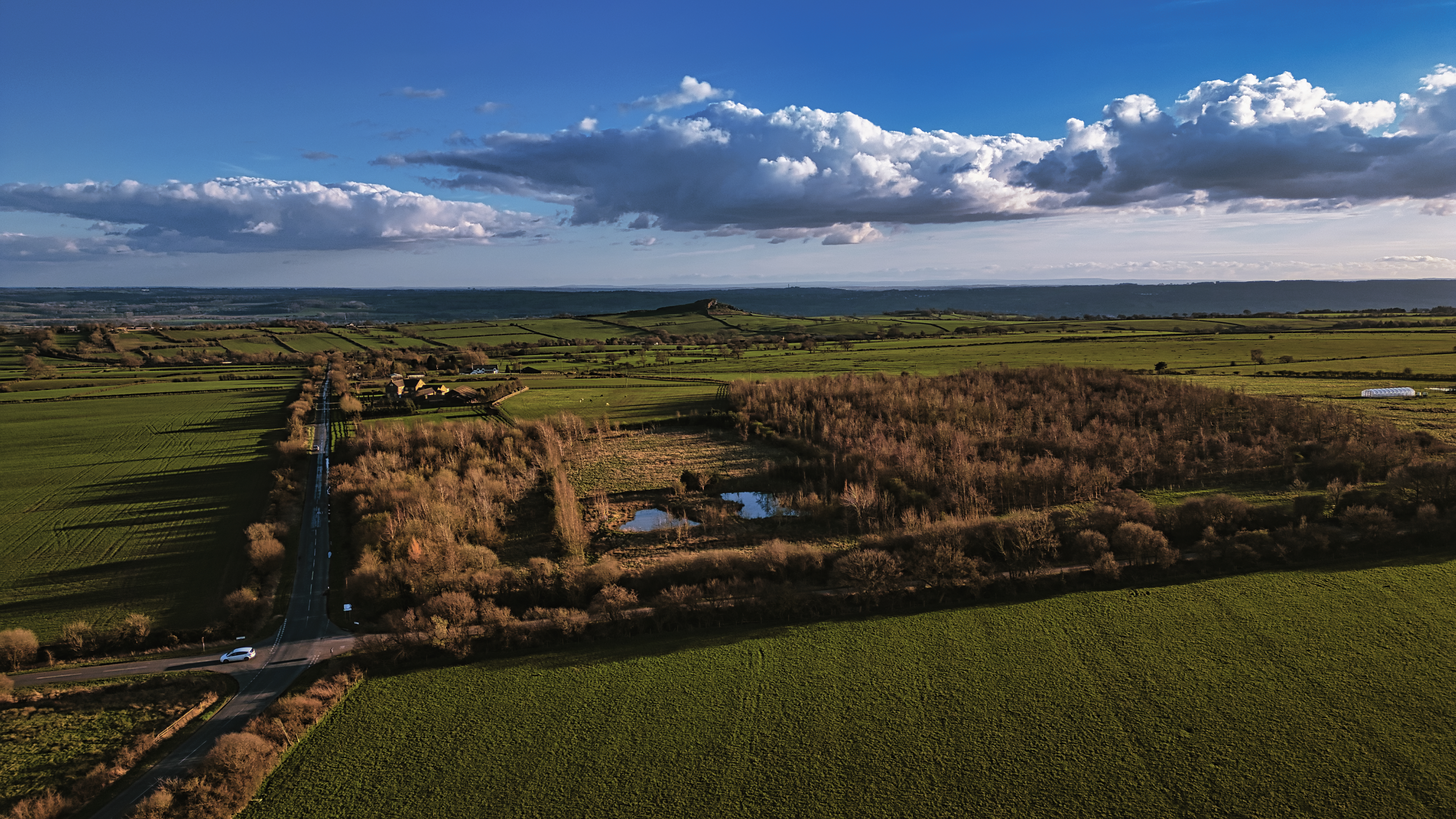 Aerial view of lush green fields with a small forest area, under a vast blue sky with fluffy clouds in North Yorkshire.