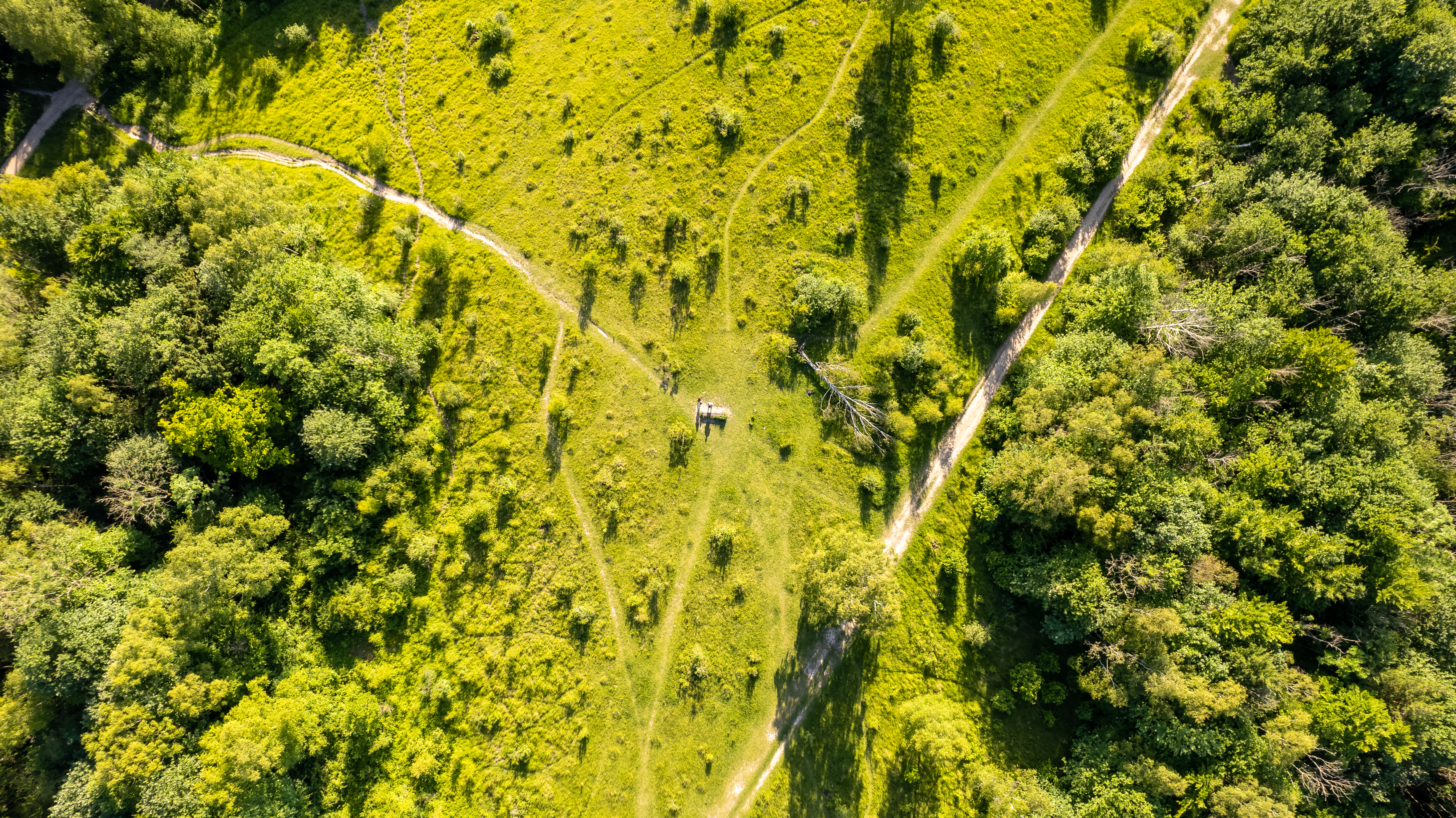Aerial view of lush green forest with winding trails and a small structure amidst the trees.