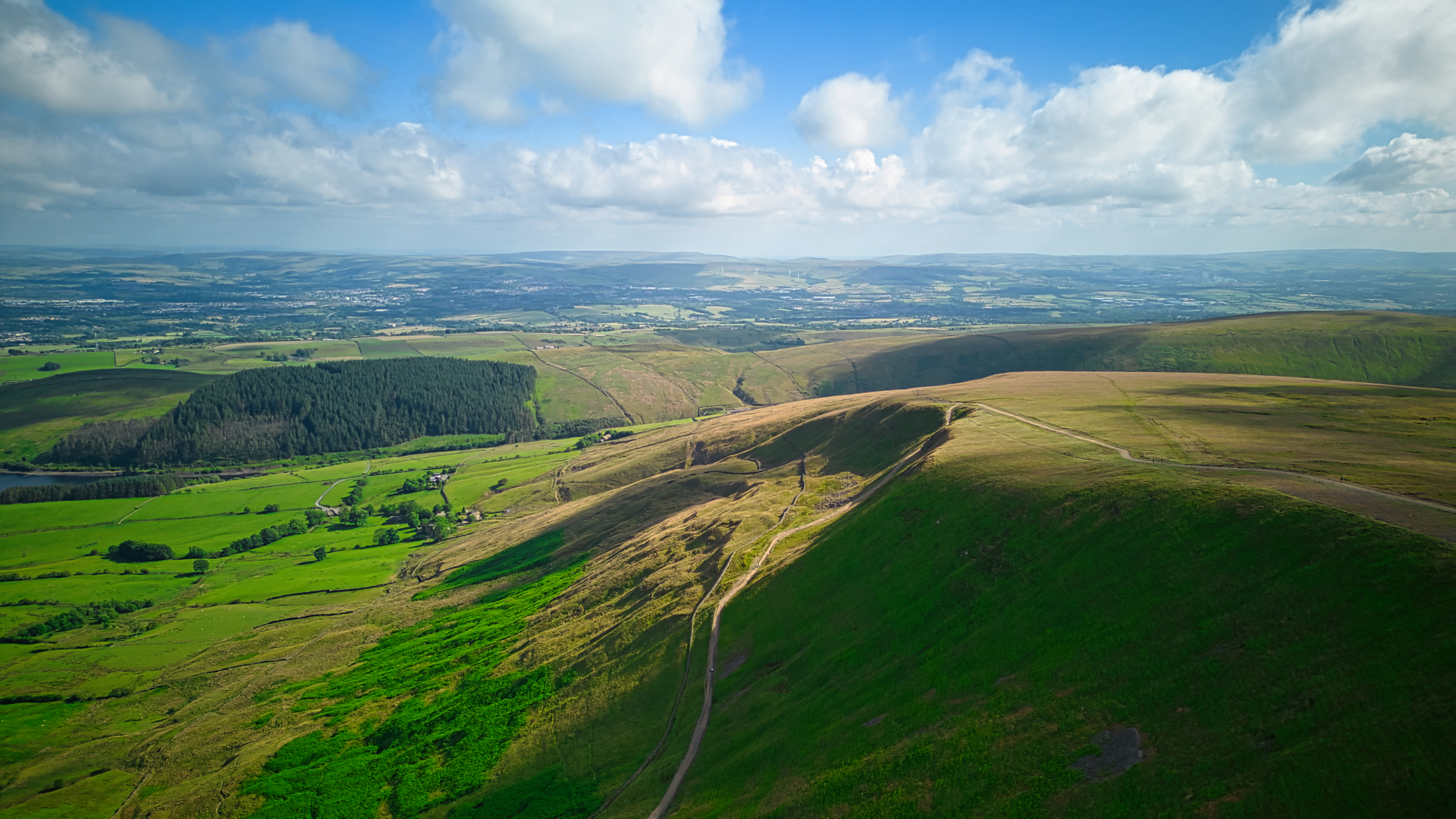 Aerial view of lush green landscape with rolling hills and a clear sky, showcasing the beauty of rural terrain in Pendle Hill, England.
