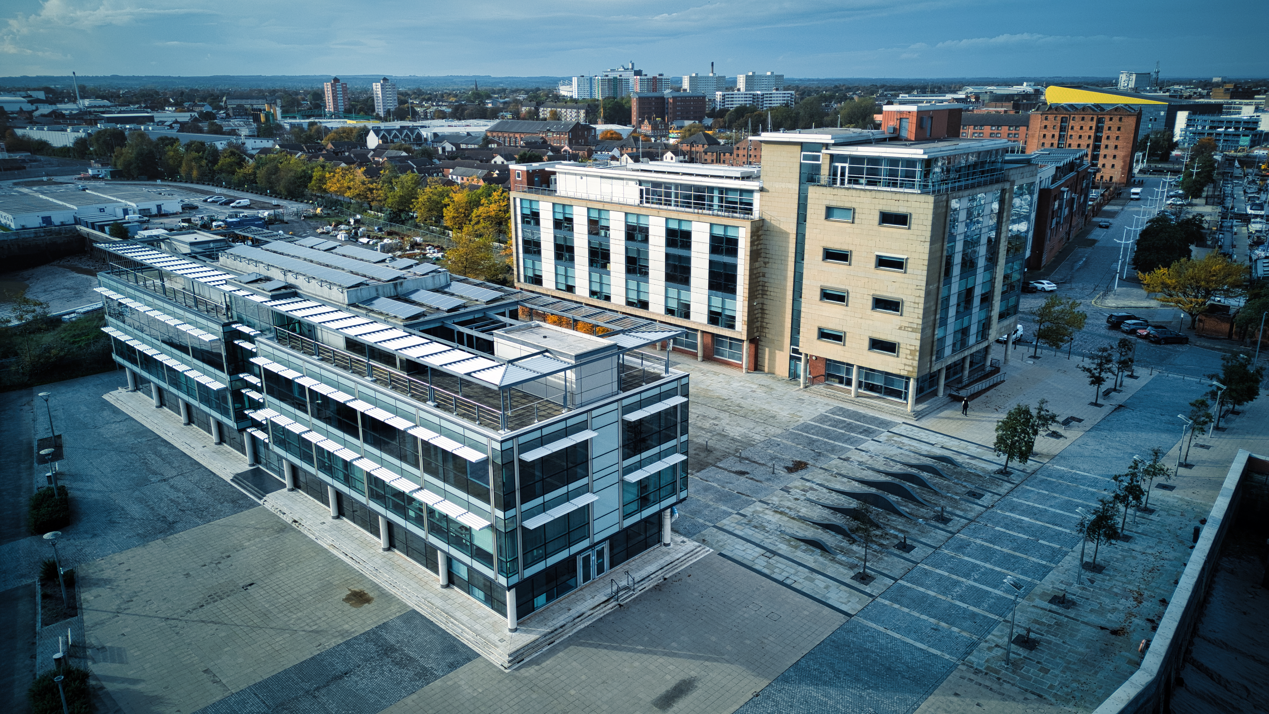 Aerial view of modern office buildings with parking lot in an urban landscape in Hull, England.