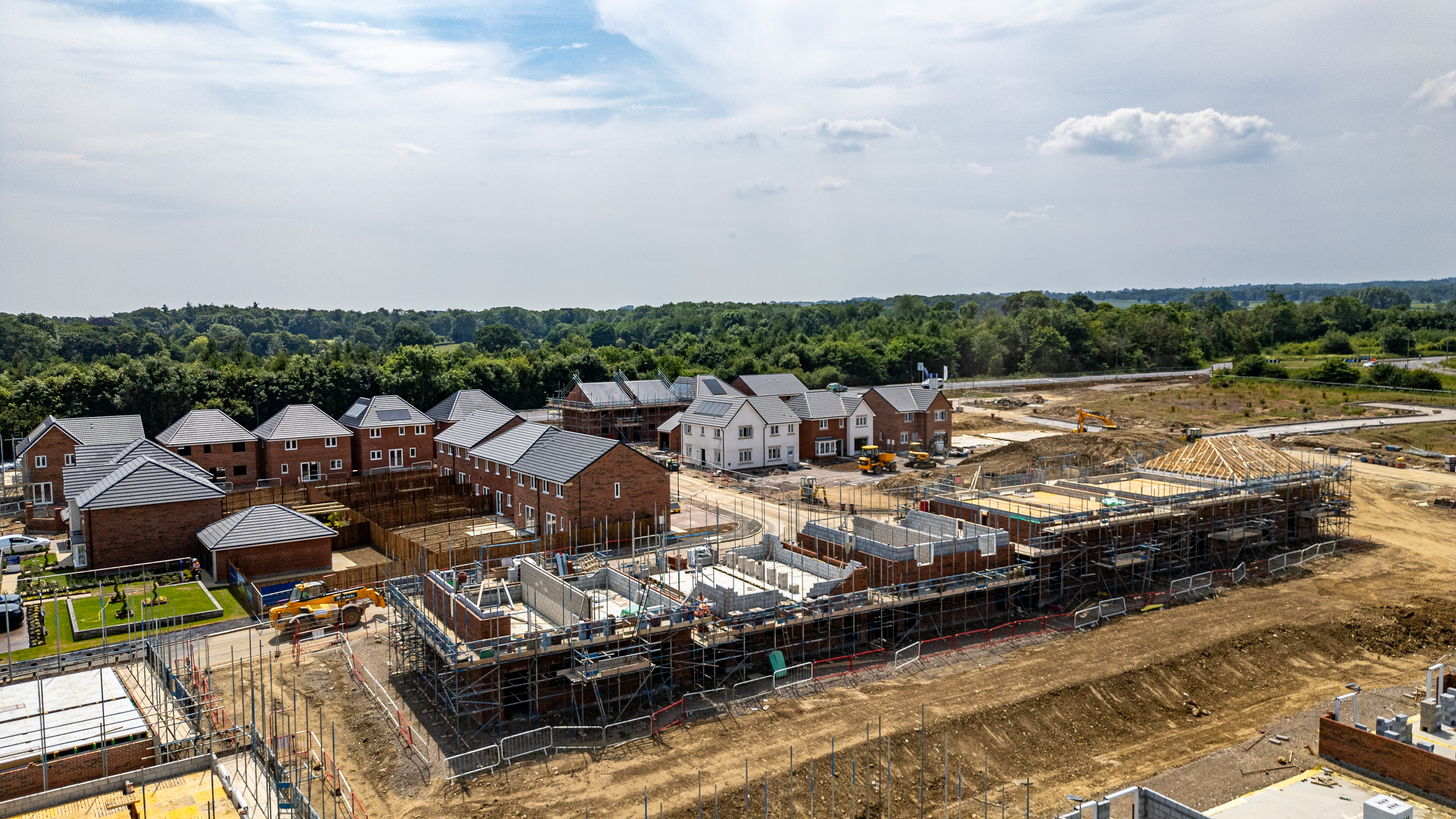 An aerial view of a new housing development under construction, with brick houses in various stages of completion and raw building sites at Miller Homes in Catterick, UK.