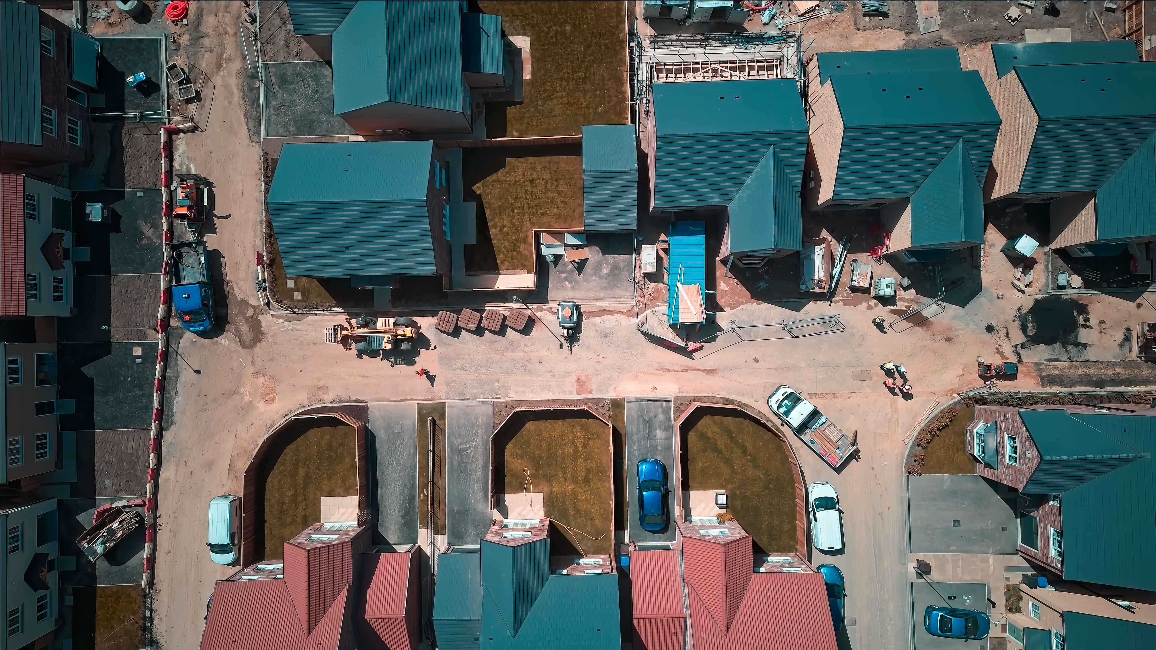 Aerial view of a residential neighborhood under construction with houses in various stages of completion. Construction materials and vehicles are visible on the site.