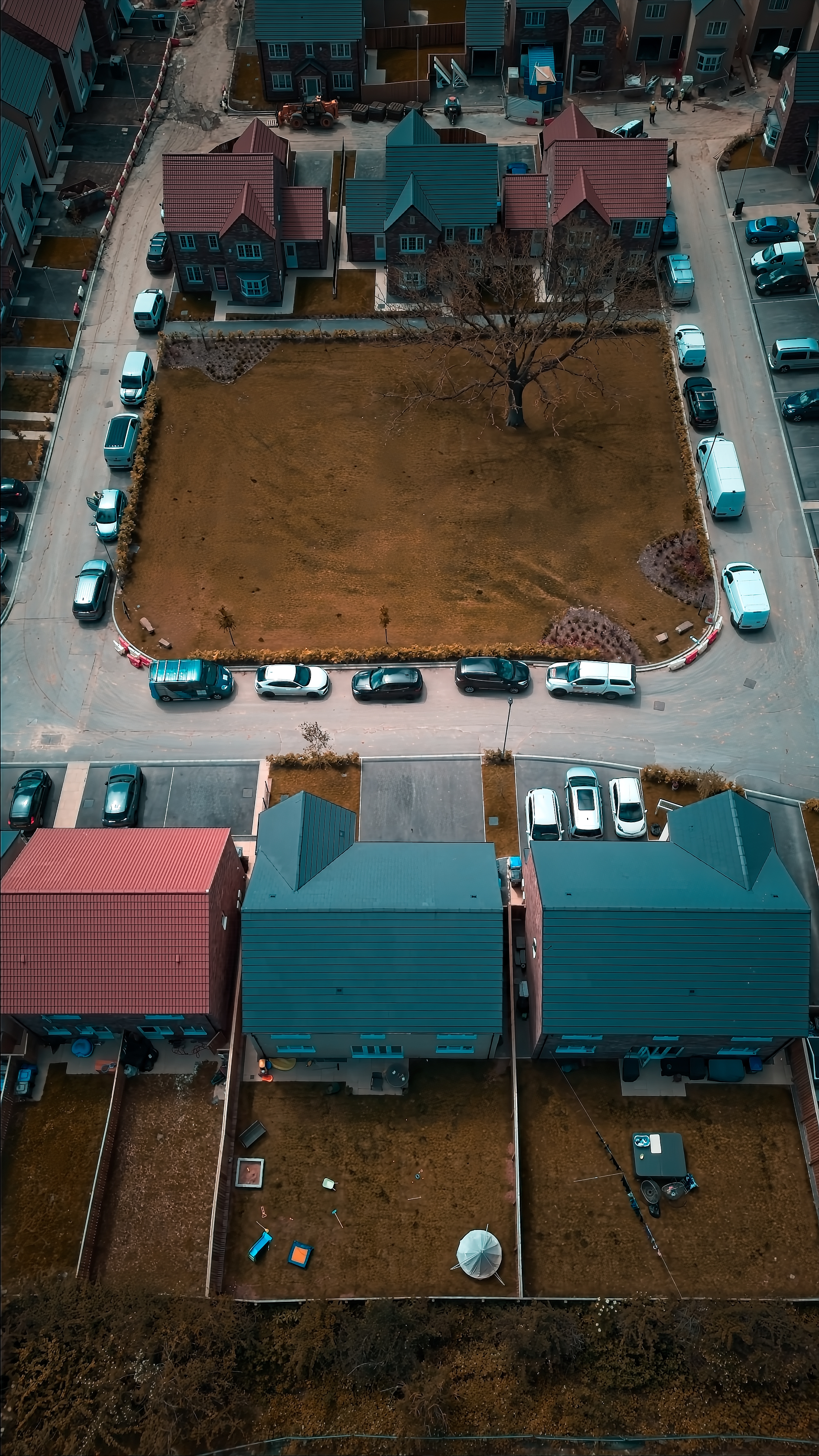 Aerial view of a residential neighborhood with houses, parked cars, and a central grassy area.
