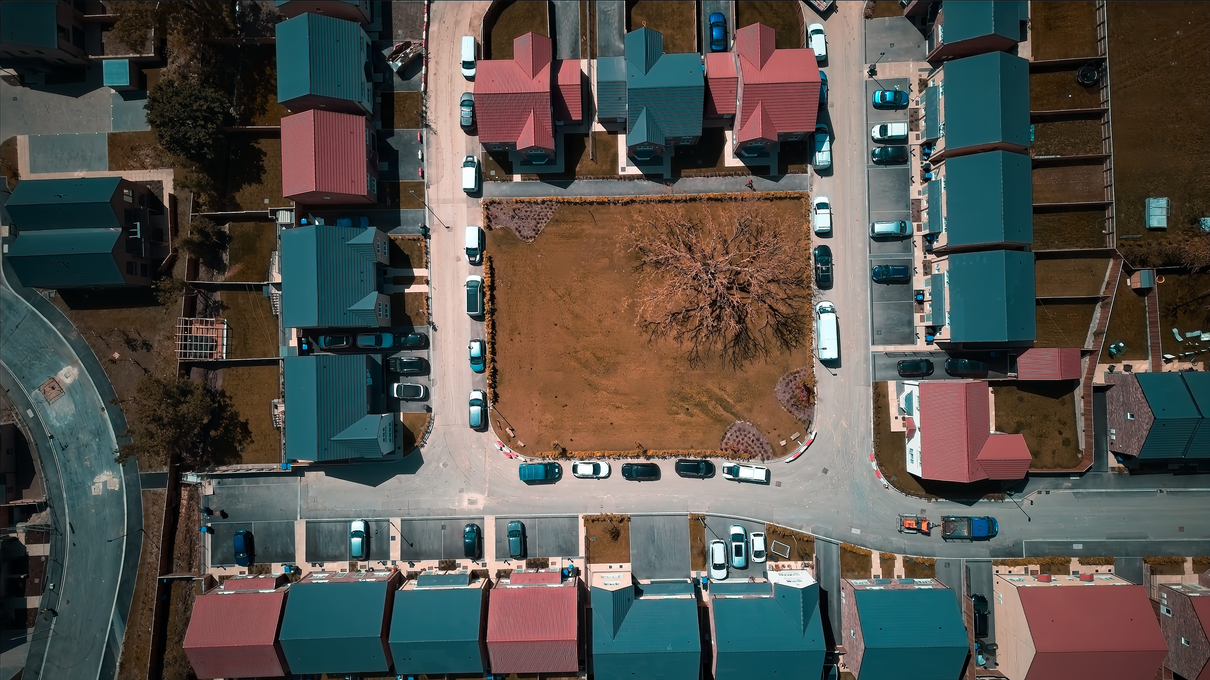 Aerial view of a residential neighborhood with houses arranged around a central barren plot of land. The houses have red and green roofs, and cars are parked along the streets.