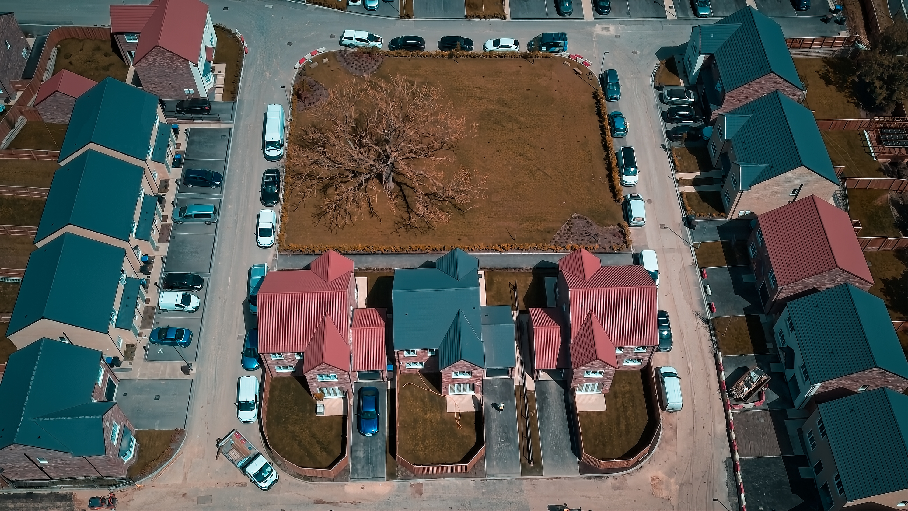Aerial view of a residential neighborhood with houses, parked cars, and a central tree in a grassy area.