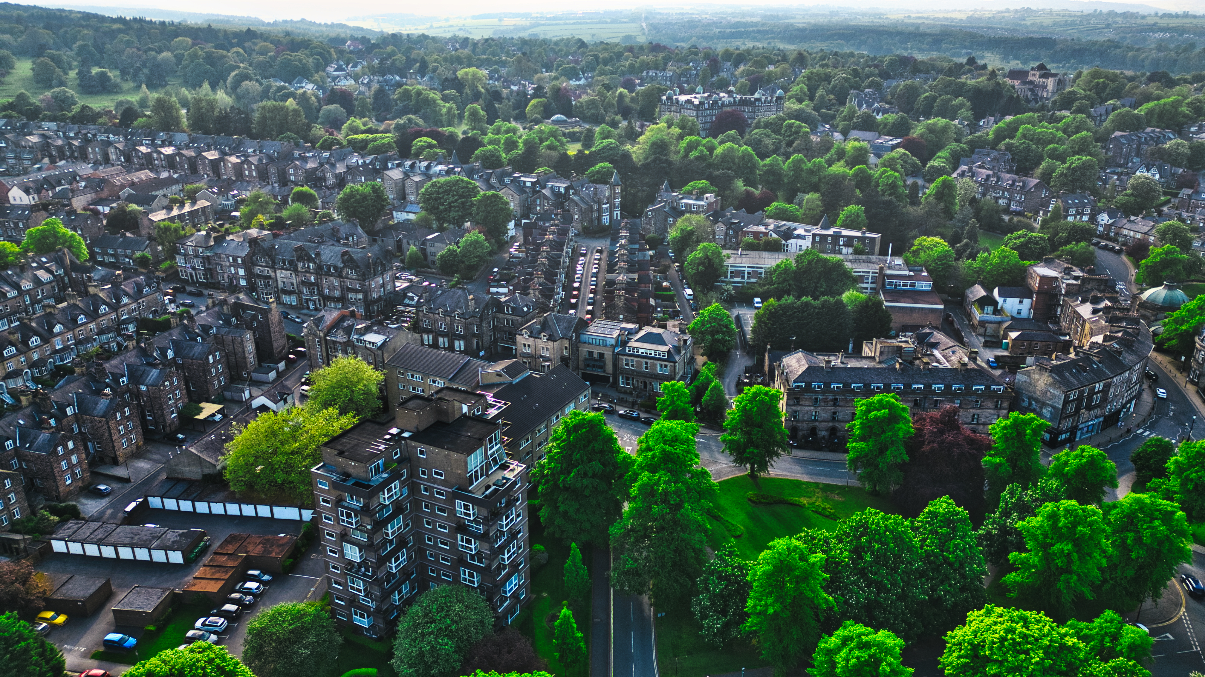 Aerial view of a residential neighborhood with a mix of houses and apartment buildings surrounded by lush green trees and vegetation.