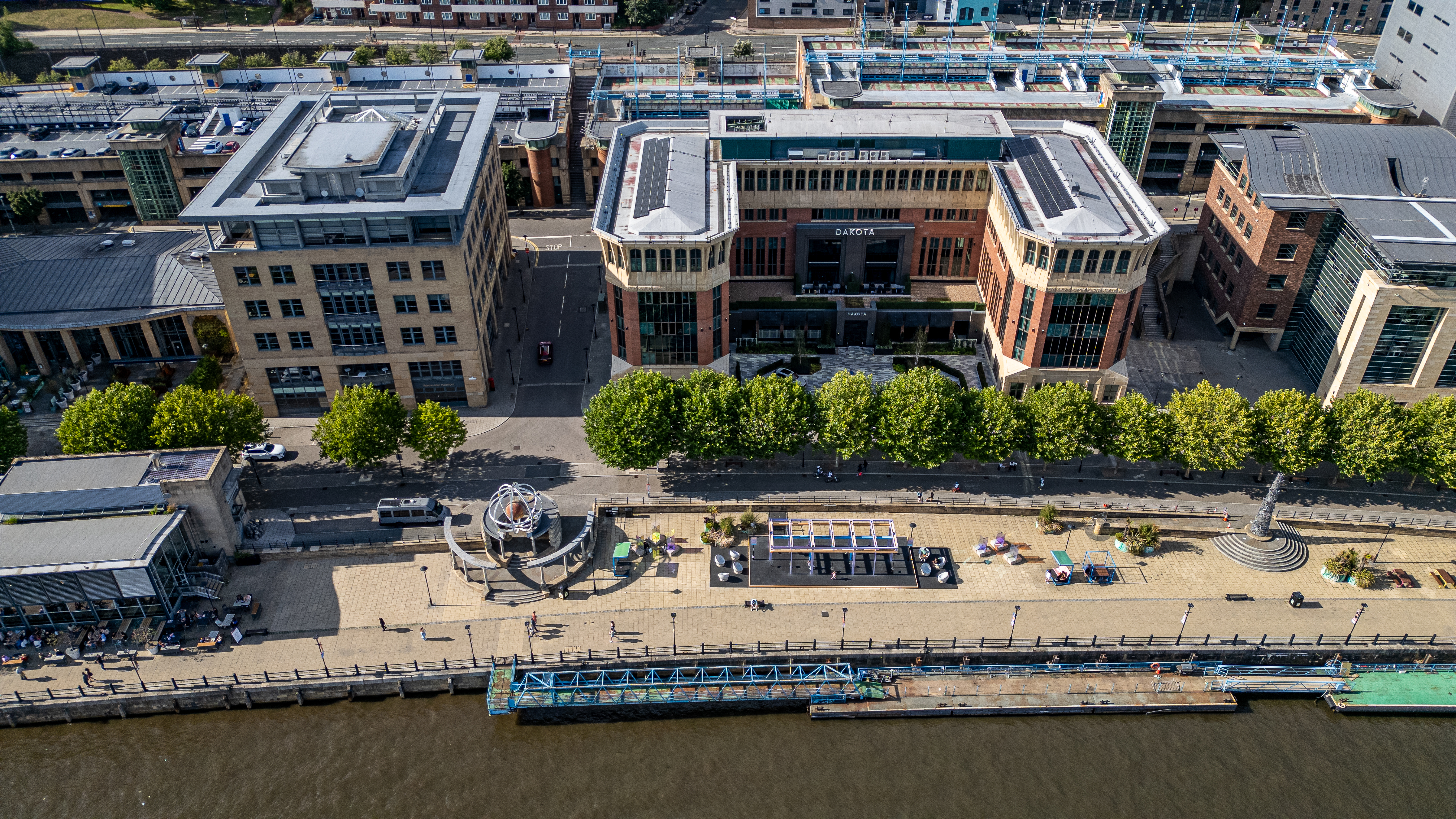 Aerial view of a modern cityscape with a river, buildings, a waterfront promenade, and trees in Newcastle upon Tyne, UK.