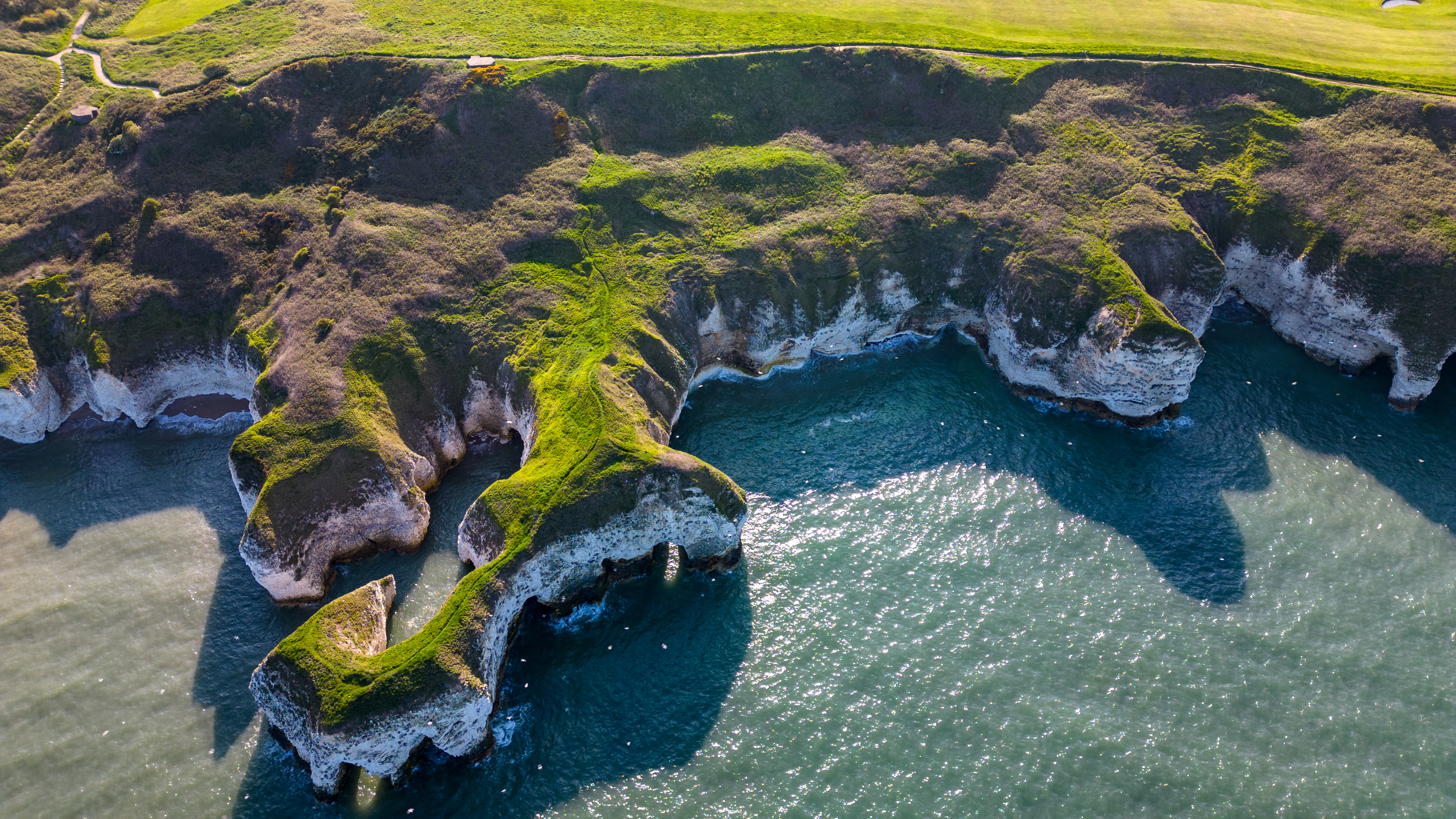 Aerial view of rugged coastline with dramatic cliffs and greenery overlooking the ocean in Flamborough, England