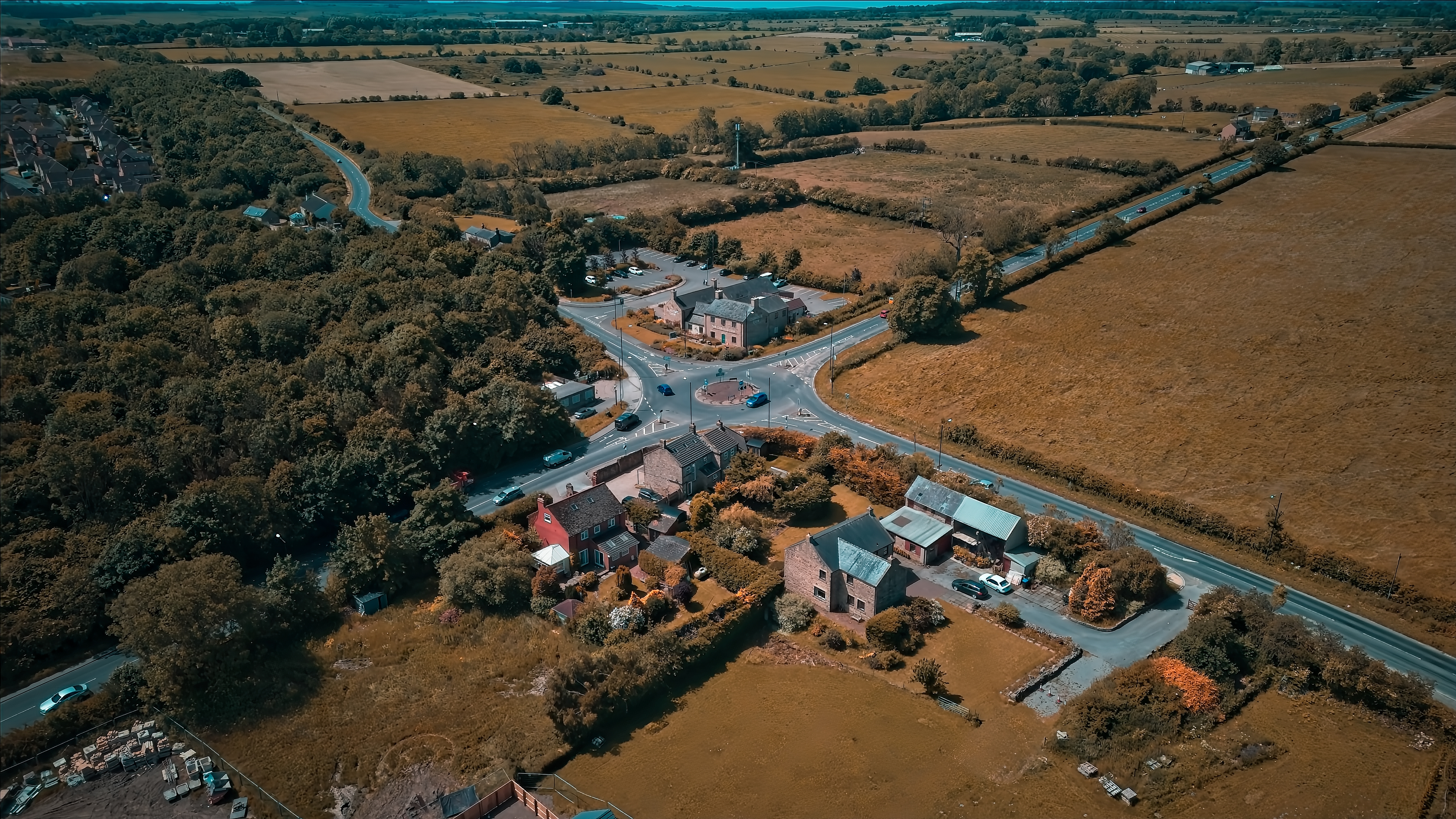 Aerial view of a rural area with houses, roads, and fields. The landscape includes a roundabout, trees, and open farmland. The sky is clear, and the overall scene is peaceful and scenic.