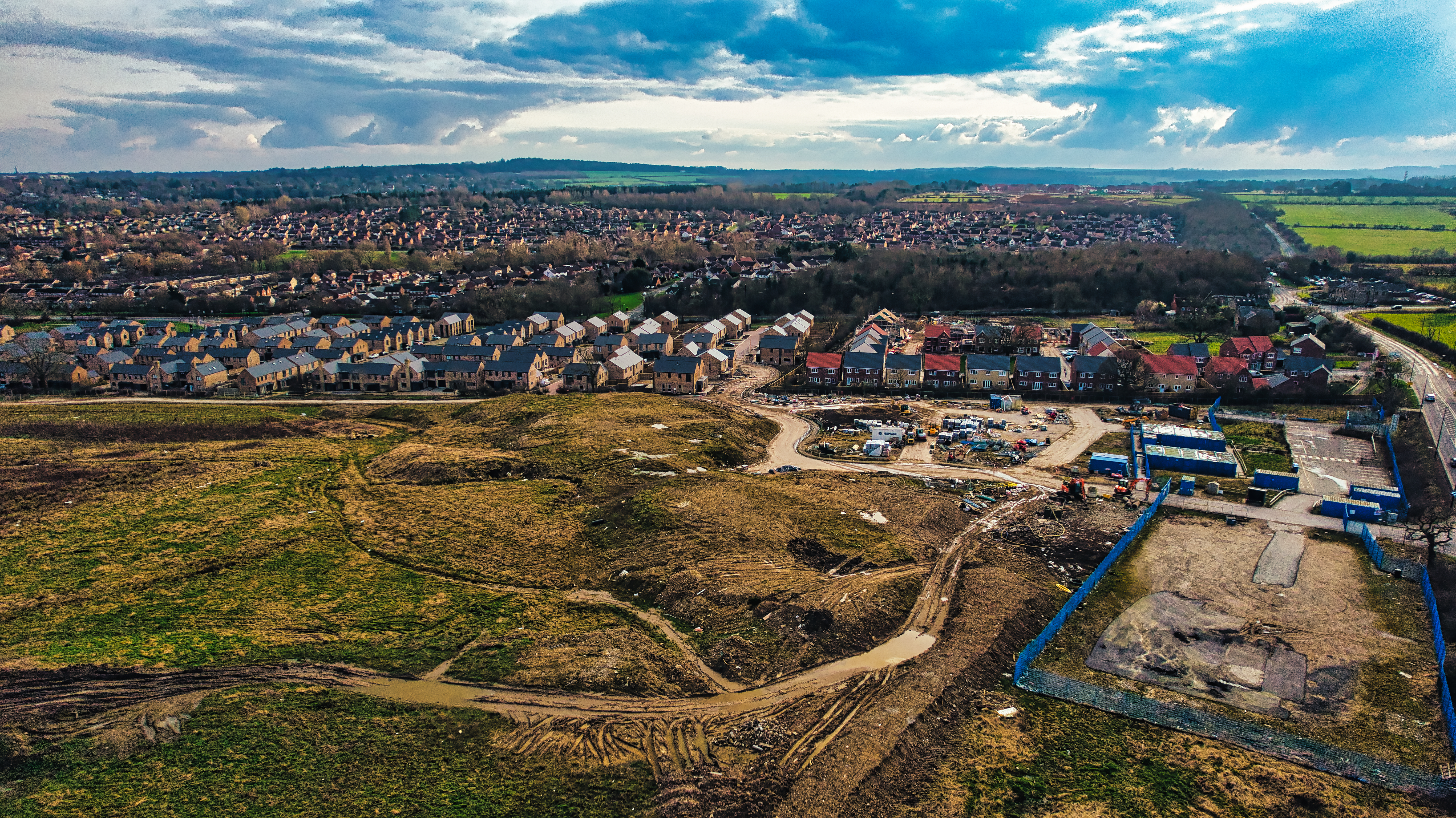 Aerial view of suburban expansion with new housing development and construction site near established neighborhood in Harrogate, North Yorkshire.