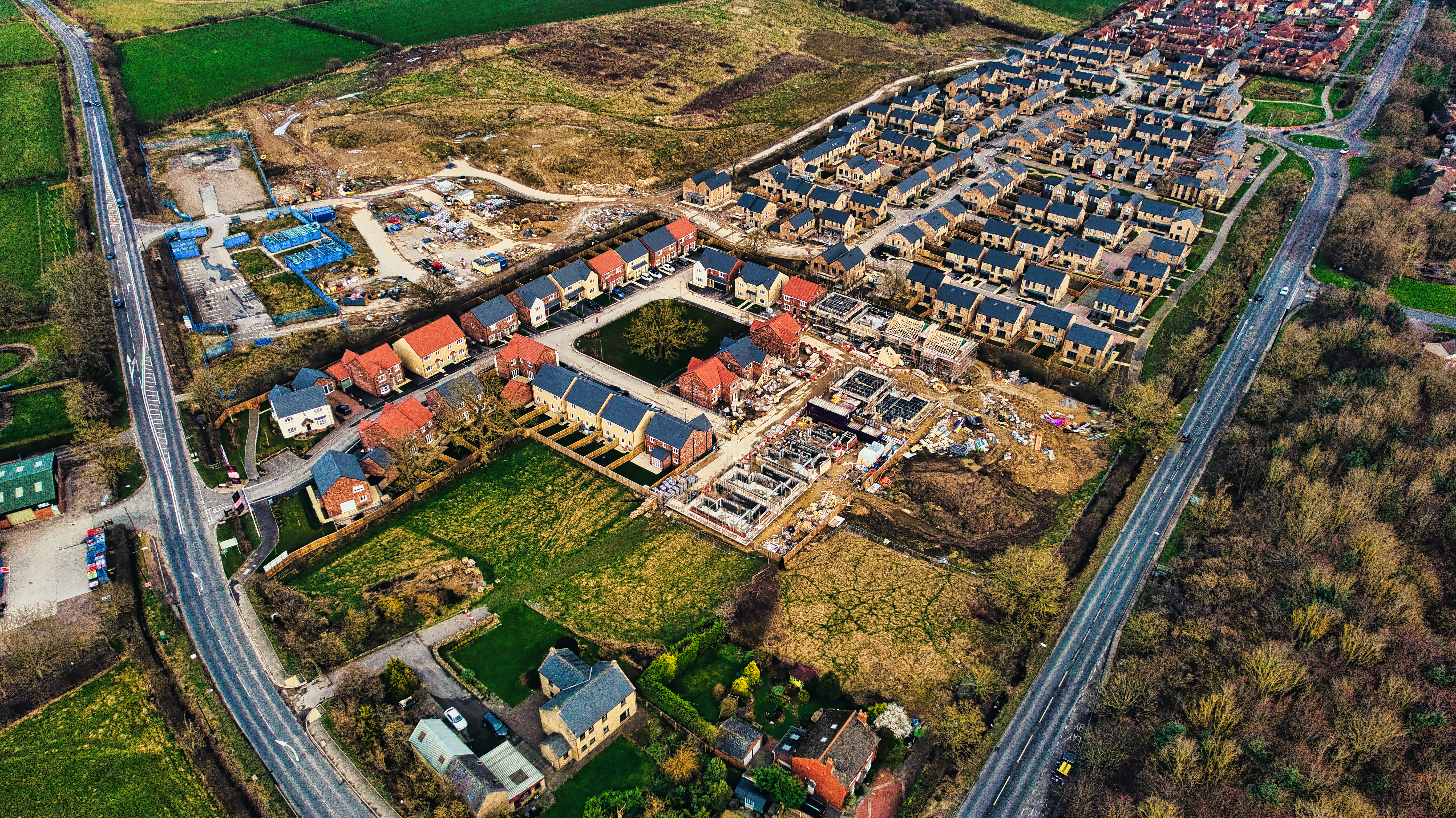 Aerial view of suburban housing development with construction site, roads, and green fields in Harrogate, North Yorkshire.