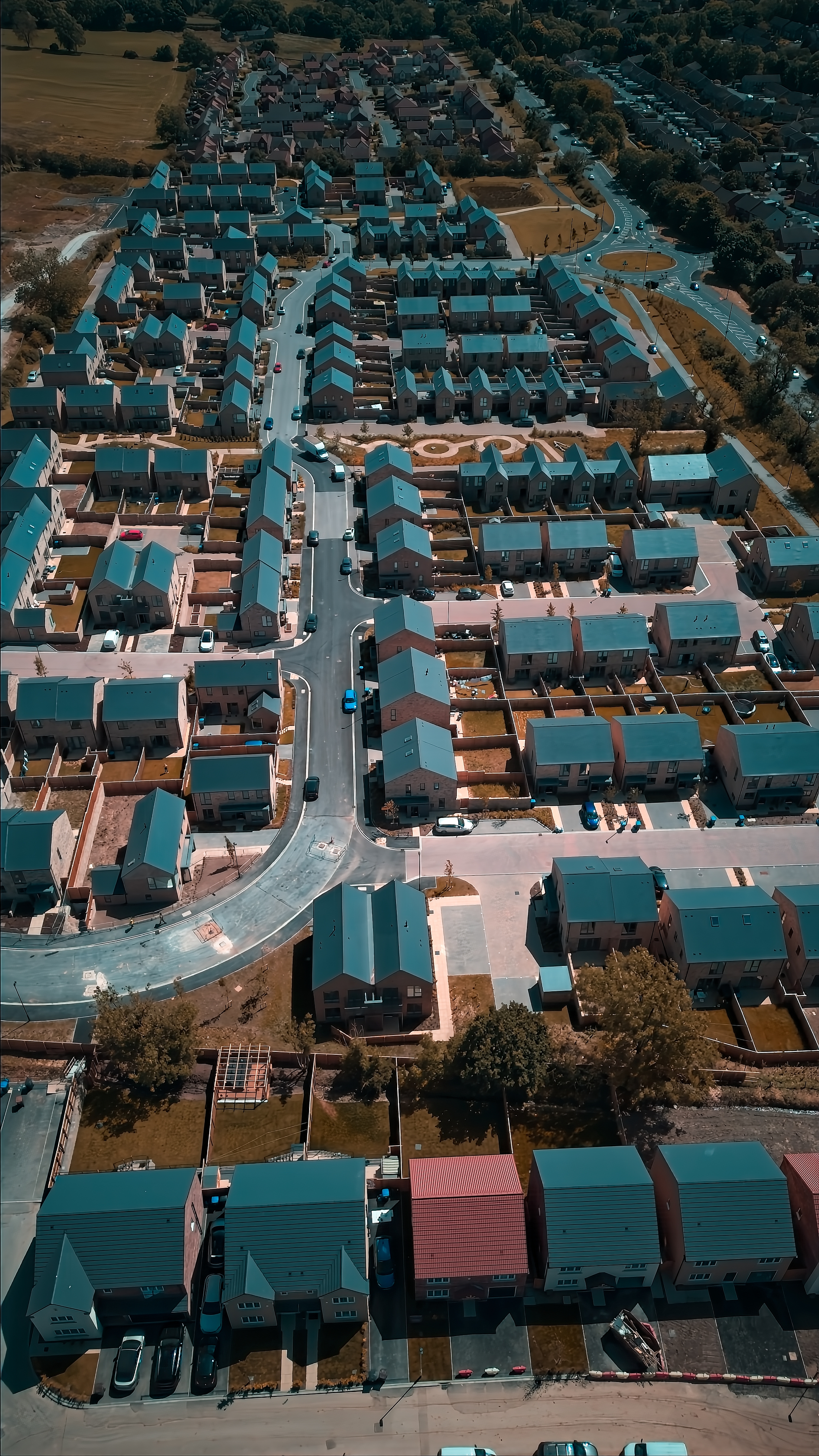 Aerial view of a suburban neighborhood with rows of houses and streets.